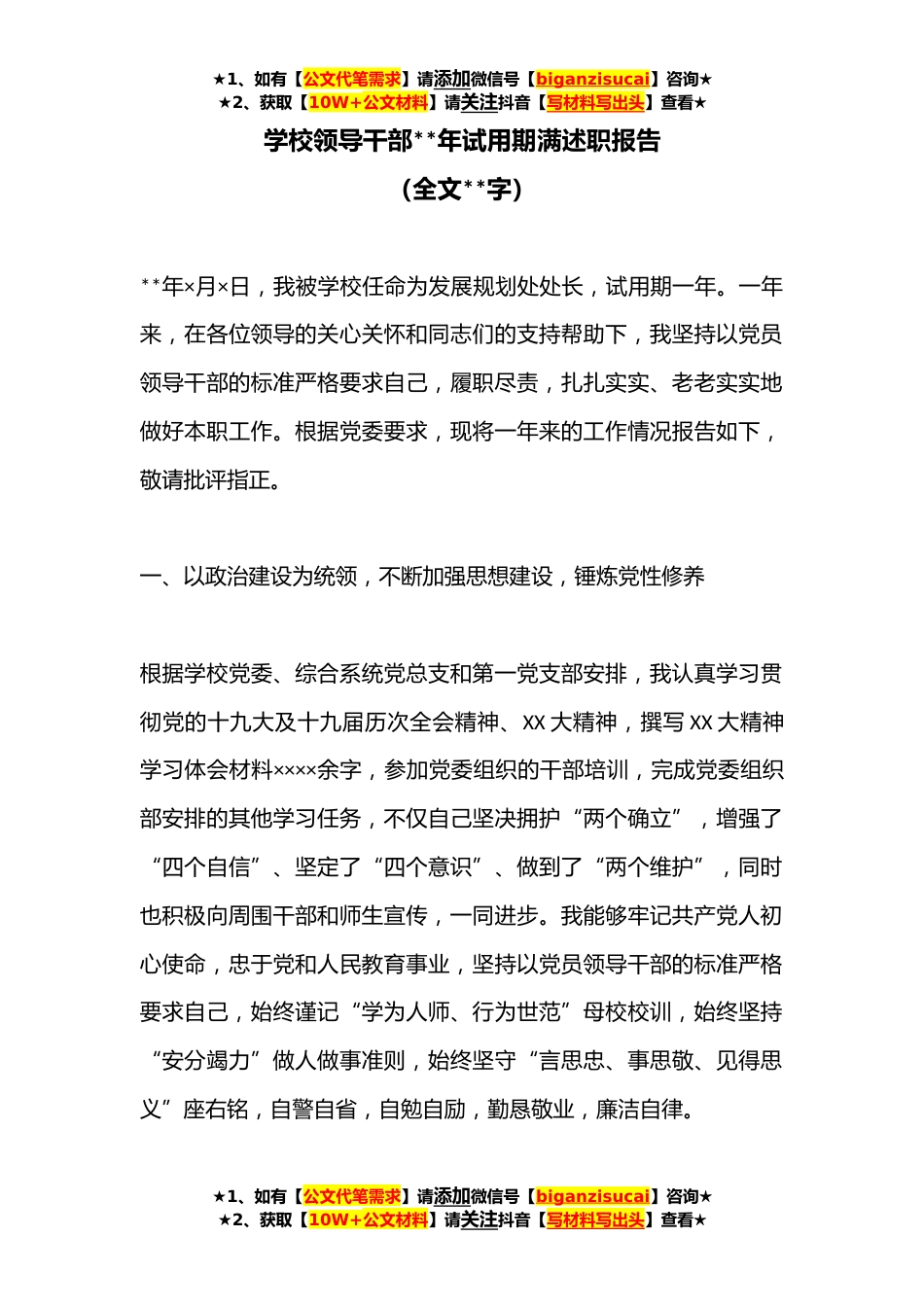 ★1、如有【公文代笔需求】请添加微信号【biganzisucai】咨询★★2、获取【10W+公文材料】请关注抖音【写材料写出头】查看★学校领导干部**年试用期满述职报告(全文**字)**年×月×日,我被学校任命为发展规划处处长,试用期一年。一年来,在各位领导的关心关怀和同志们的支持帮助下,我坚持以党员领导干部的标准严格要求自己,履职尽责,扎扎实实、老老实实地做好本职工作。根据党委要求,现将一年来的工作情况报告如下,敬请批评指正。一、以政治建设为统领,不断加强思想建设,锤炼党性修养根据学校党委、综合系统党总支和第一党支部安排,我认真学习贯彻党的十九大及十九届历次全会精神、XX大精神,撰写XX大精神学习体会材料××××余字,参加党委组织的干部培训,完成党委组织部安排的其他学习任务,不仅...