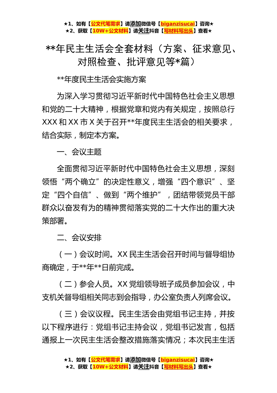 ★1、如有【公文代笔需求】请添加微信号【biganzisucai】咨询★★2、获取【10W+公文材料】请关注抖音【写材料写出头】查看★★1、如有【公文代笔需求】请添加微信号【biganzisucai】咨询★★2、获取【10W+公文材料】请关注抖音【写材料写出头】查看★★1、如有【公文代笔需求】请添加微信号【biganzisucai】咨询★★2、获取【10W+公文材料】请关注抖音【写材料写出头】查看★**年民主生活会全套材料(方案、征求意见、对照检查、批评意见等*篇)**年度民主生活会实施方案为深入学习贯彻习近平新时代中国特色社会主义思想和党的二十大精神,根据党章和党内有关规定,按照总行XXX和XX市X关于召开**年度民主生活会的相关要求,结合实际,制定本方案。一、会议主题全面贯彻习近平新时代中国特色社会主义思想,深刻领悟...