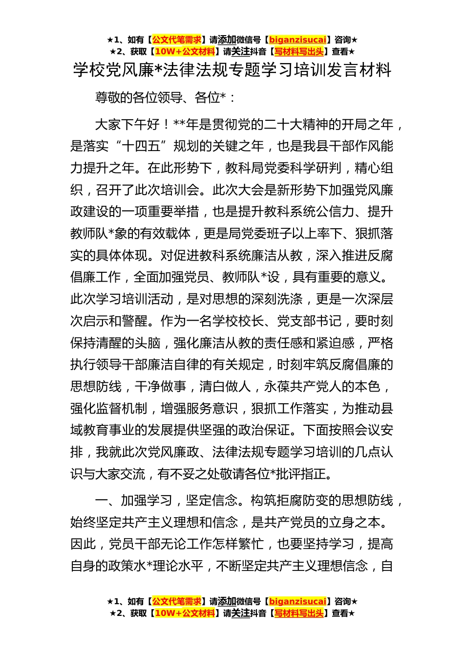 ★1、如有【公文代笔需求】请添加微信号【biganzisucai】咨询★★2、获取【10W+公文材料】请关注抖音【写材料写出头】查看★★1、如有【公文代笔需求】请添加微信号【biganzisucai】咨询★★2、获取【10W+公文材料】请关注抖音【写材料写出头】查看★★1、如有【公文代笔需求】请添加微信号【biganzisucai】咨询★★2、获取【10W+公文材料】请关注抖音【写材料写出头】查看★学校党风廉*法律法规专题学习培训发言材料尊敬的各位领导、各位*:大家下午好!**年是贯彻党的二十大精神的开局之年,是落实“十四五”规划的关键之年,也是我县干部作风能力提升之年。在此形势下,教科局党委科学研判,精心组织,召开了此次培训会。此次大会是新形势下加强党风廉政建设的一项重要举措,也是提升教科系统公信力、提升教师...