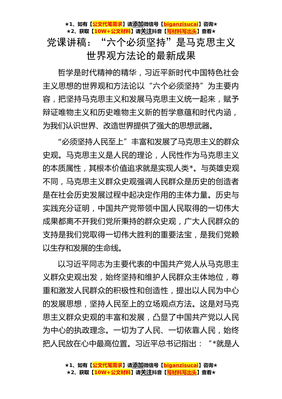 ★1、如有【公文代笔需求】请添加微信号【biganzisucai】咨询★★2、获取【10W+公文材料】请关注抖音【写材料写出头】查看★★1、如有【公文代笔需求】请添加微信号【biganzisucai】咨询★★2、获取【10W+公文材料】请关注抖音【写材料写出头】查看★★1、如有【公文代笔需求】请添加微信号【biganzisucai】咨询★★2、获取【10W+公文材料】请关注抖音【写材料写出头】查看★党课讲稿:“六个必须坚持”是马克思主义世界观方法论的最新成果哲学是时代精神的精华,习近平新时代中国特色社会主义思想的世界观和方法论以“六个必须坚持”为主要内容,把坚持马克思主义和发展马克思主义统一起来,赋予辩证唯物主义和历史唯物主义新的哲学意蕴和时代内涵,为我们认识世界、改造世界提供了强大的思想武器。“必须坚持人...