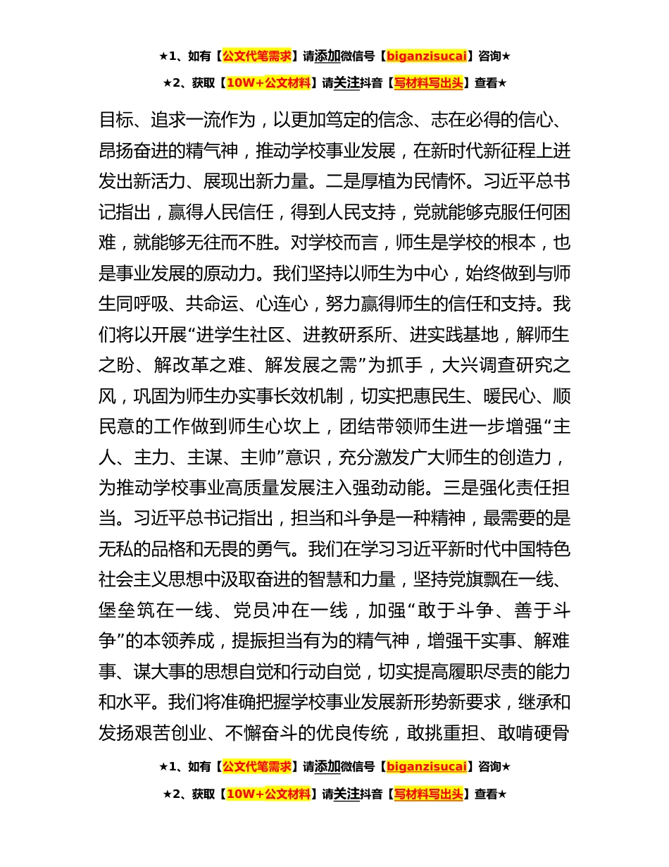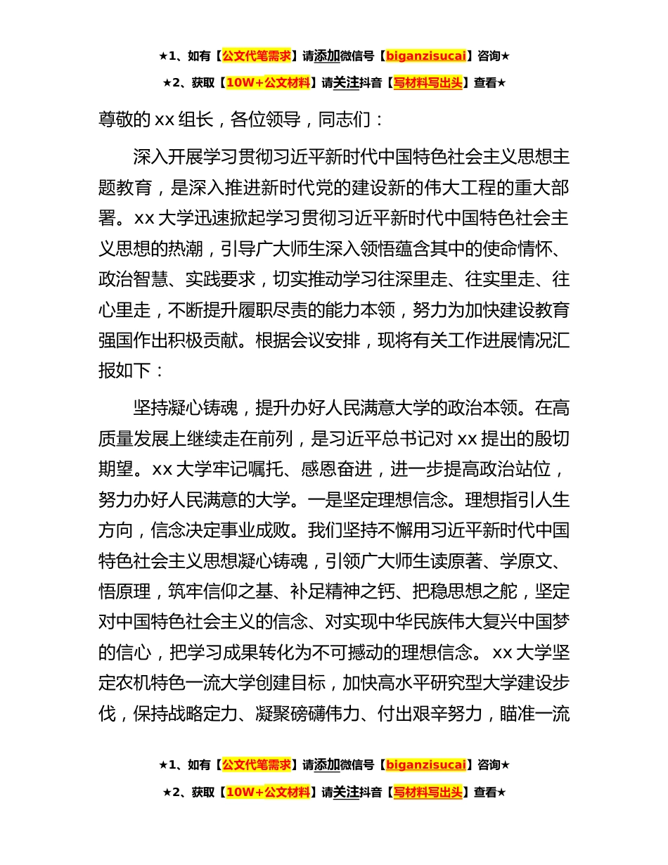 ★1、如有【公文代笔需求】请添加微信号【biganzisucai】咨询★★2、获取【10W+公文材料】请关注抖音【写材料写出头】查看★尊敬的xx组长,各位领导,同志们:深入开展学习贯彻习近平新时代中国特色社会主义思想主题教育,是深入推进新时代党的建设新的伟大工程的重大部署。xx大学迅速掀起学习贯彻习近平新时代中国特色社会主义思想的热潮,引导广大师生深入领悟蕴含其中的使命情怀、政治智慧、实践要求,切实推动学习往深里走、往实里走、往心里走,不断提升履职尽责的能力本领,努力为加快建设教育强国作出积极贡献。根据会议安排,现将有关工作进展情况汇报如下:坚持凝心铸魂,提升办好人民满意大学的政治本领。在高质量发展上继续走在前列,是习近平总书记对xx提出的殷切期望。xx大学牢记嘱托、感恩奋进,进...