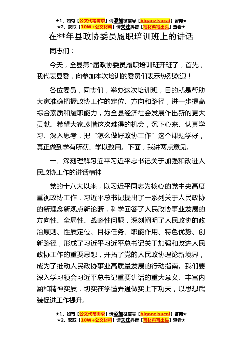 ★1、如有【公文代笔需求】请添加微信号【biganzisucai】咨询★★2、获取【10W+公文材料】请关注抖音【写材料写出头】查看★★1、如有【公文代笔需求】请添加微信号【biganzisucai】咨询★★2、获取【10W+公文材料】请关注抖音【写材料写出头】查看★★1、如有【公文代笔需求】请添加微信号【biganzisucai】咨询★★2、获取【10W+公文材料】请关注抖音【写材料写出头】查看★在**年县政协委员履职培训班上的讲话同志们:今天,全县第*届政协委员履职培训班开班了,首先,我代表县委,向参加本次培训的委员们表示热烈欢迎!各位委员,同志们,举办这次培训班,目的就是帮助大家准确把握政协工作的定位、方向和路径,进一步提高综合素质和履职能力,为全县经济社会发展作出新的更大贡献。希望大家珍惜这次难得的机会...
