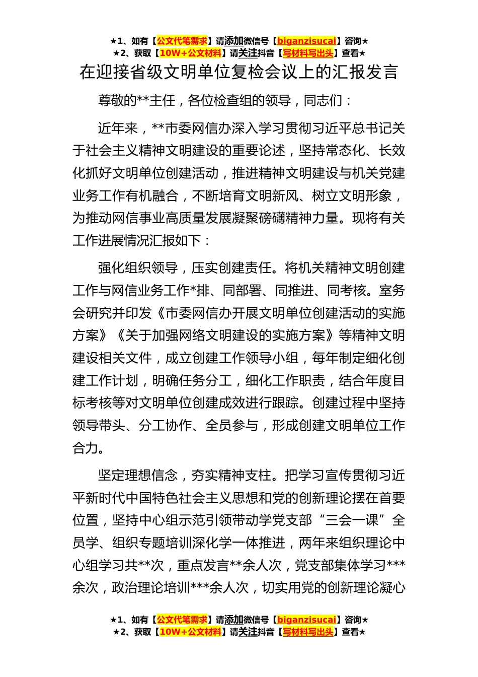 ★1、如有【公文代笔需求】请添加微信号【biganzisucai】咨询★★2、获取【10W+公文材料】请关注抖音【写材料写出头】查看★★1、如有【公文代笔需求】请添加微信号【biganzisucai】咨询★★2、获取【10W+公文材料】请关注抖音【写材料写出头】查看★★1、如有【公文代笔需求】请添加微信号【biganzisucai】咨询★★2、获取【10W+公文材料】请关注抖音【写材料写出头】查看★在迎接省级文明单位复检会议上的汇报发言尊敬的**主任,各位检查组的领导,同志们:近年来,**市委网信办深入学习贯彻习近平总书记关于社会主义精神文明建设的重要论述,坚持常态化、长效化抓好文明单位创建活动,推进精神文明建设与机关党建业务工作有机融合,不断培育文明新风、树立文明形象,为推动网信事业高质量发展凝聚磅礴精神力量...