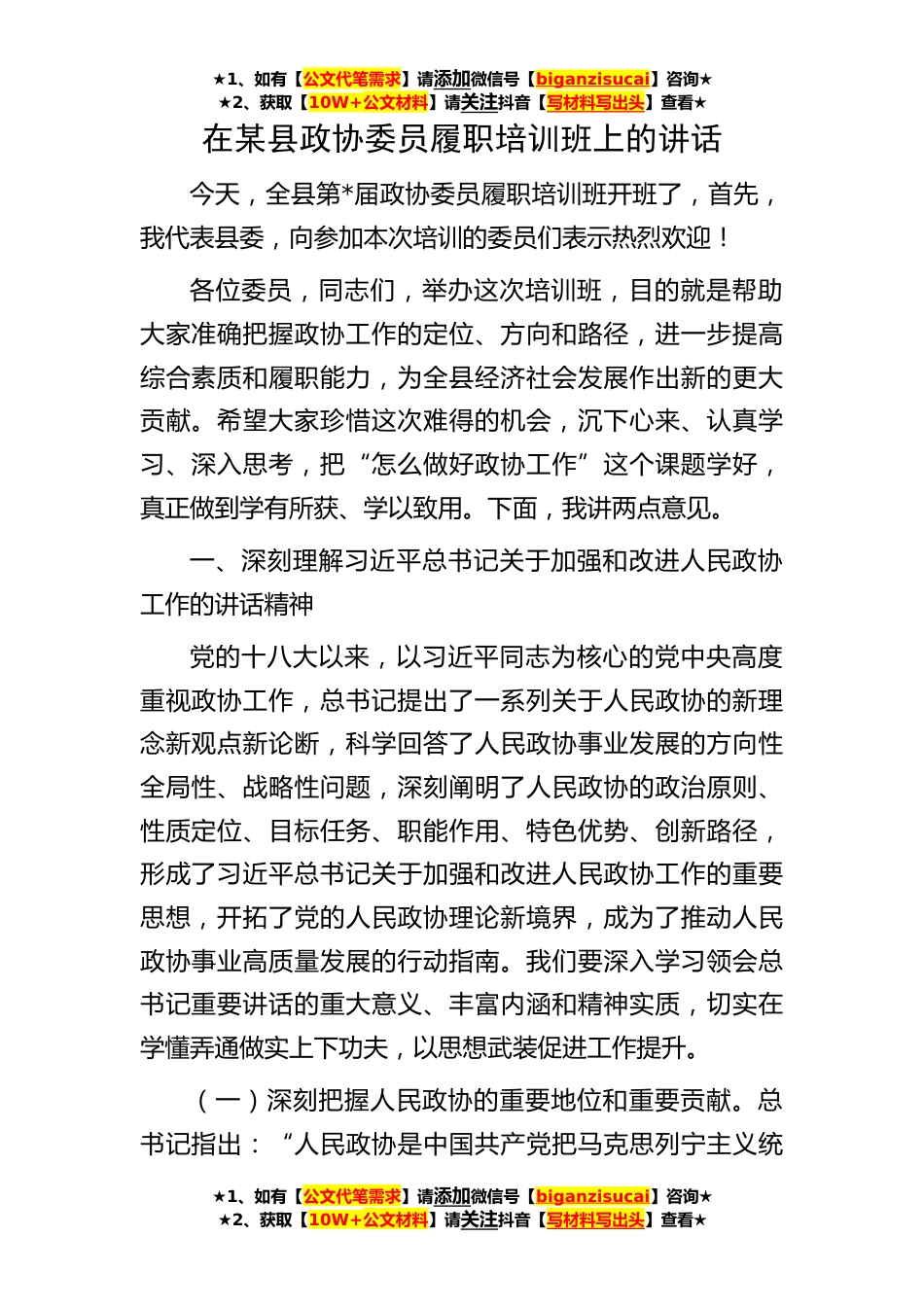 ★1、如有【公文代笔需求】请添加微信号【biganzisucai】咨询★★2、获取【10W+公文材料】请关注抖音【写材料写出头】查看★★1、如有【公文代笔需求】请添加微信号【biganzisucai】咨询★★2、获取【10W+公文材料】请关注抖音【写材料写出头】查看★★1、如有【公文代笔需求】请添加微信号【biganzisucai】咨询★★2、获取【10W+公文材料】请关注抖音【写材料写出头】查看★在某县政协委员履职培训班上的讲话今天,全县第*届政协委员履职培训班开班了,首先,我代表县委,向参加本次培训的委员们表示热烈欢迎!各位委员,同志们,举办这次培训班,目的就是帮助大家准确把握政协工作的定位、方向和路径,进一步提高综合素质和履职能力,为全县经济社会发展作出新的更大贡献。希望大家珍惜这次难得的机会,沉下心来...