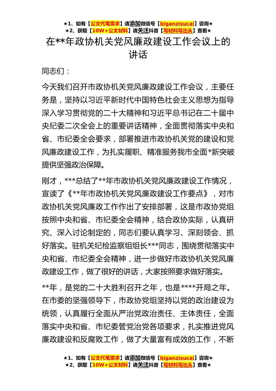 ★1、如有【公文代笔需求】请添加微信号【biganzisucai】咨询★★2、获取【10W+公文材料】请关注抖音【写材料写出头】查看★★1、如有【公文代笔需求】请添加微信号【biganzisucai】咨询★★2、获取【10W+公文材料】请关注抖音【写材料写出头】查看★★1、如有【公文代笔需求】请添加微信号【biganzisucai】咨询★★2、获取【10W+公文材料】请关注抖音【写材料写出头】查看★在**年政协机关党风廉政建设工作会议上的讲话同志们:今天我们召开市政协机关党风廉政建设工作会议,主要任务是,坚持以习近平新时代中国特色社会主义思想为指导深入学习贯彻党的二十大精神和习近平总书记在二十届中央纪委二次全会上的重要讲话精神,全面贯彻落实中央和省、市纪委全会要求,部署推进市政协机关党的建设和党风廉政建设工作...