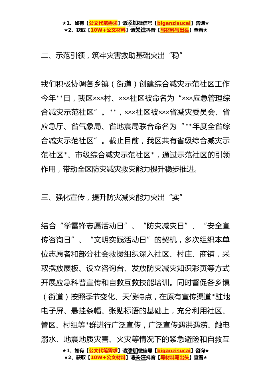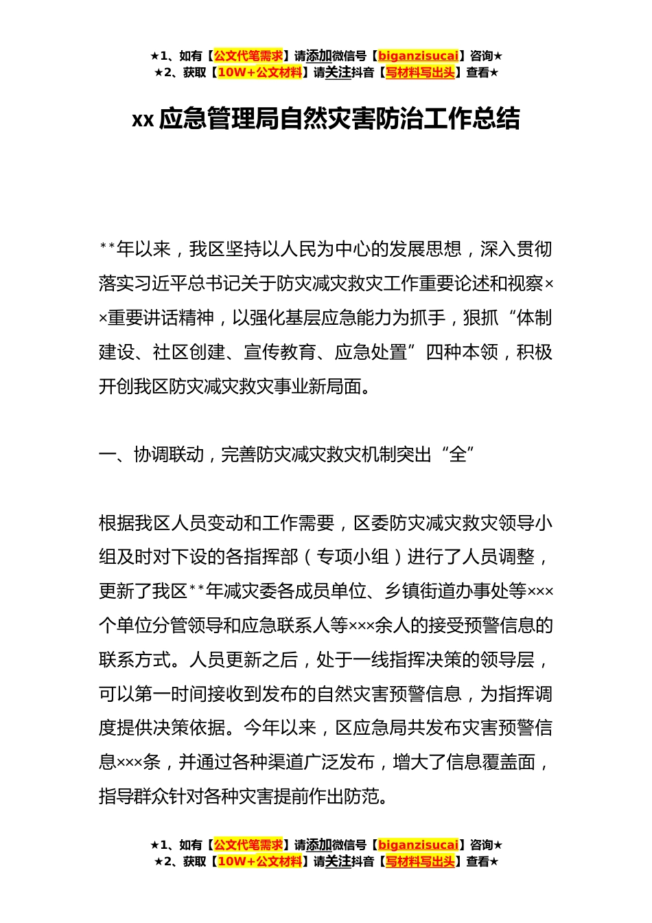 ★1、如有【公文代笔需求】请添加微信号【biganzisucai】咨询★★2、获取【10W+公文材料】请关注抖音【写材料写出头】查看★xx应急管理局自然灾害防治工作总结**年以来,我区坚持以人民为中心的发展思想,深入贯彻落实习近平总书记关于防灾减灾救灾工作重要论述和视察××重要讲话精神,以强化基层应急能力为抓手,狠抓“体制建设、社区创建、宣传教育、应急处置”四种本领,积极开创我区防灾减灾救灾事业新局面。一、协调联动,完善防灾减灾救灾机制突出“全”根据我区人员变动和工作需要,区委防灾减灾救灾领导小组及时对下设的各指挥部(专项小组)进行了人员调整,更新了我区**年减灾委各成员单位、乡镇街道办事处等×××个单位分管领导和应急联系人等×××余人的接受预警信息的联系方式。人员更新之后,处...