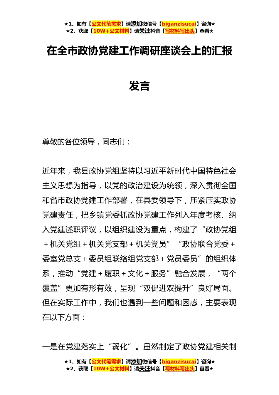 ★1、如有【公文代笔需求】请添加微信号【biganzisucai】咨询★★2、获取【10W+公文材料】请关注抖音【写材料写出头】查看★在全市政协党建工作调研座谈会上的汇报发言尊敬的各位领导,同志们:近年来,我县政协党组坚持以习近平新时代中国特色社会主义思想为指导,以党的政治建设为统领,深入贯彻全国和省市政协党建工作部署,在县委领导下,压紧压实政协党建责任,把乡镇党委抓政协党建工作列入年度考核、纳入党建述职评议,以组织建设为重点,构建了“政协党组+机关党组+机关党支部+机关党员”“政协联合党委+委室党总支+委员组联络组党支部+党员委员”的组织体系,推动“党建+履职+文化+服务”融合发展,“两个覆盖”更加有形有效,呈现“双促进双提升”良好局面。但在实际工作中,我们也遇到一些问...