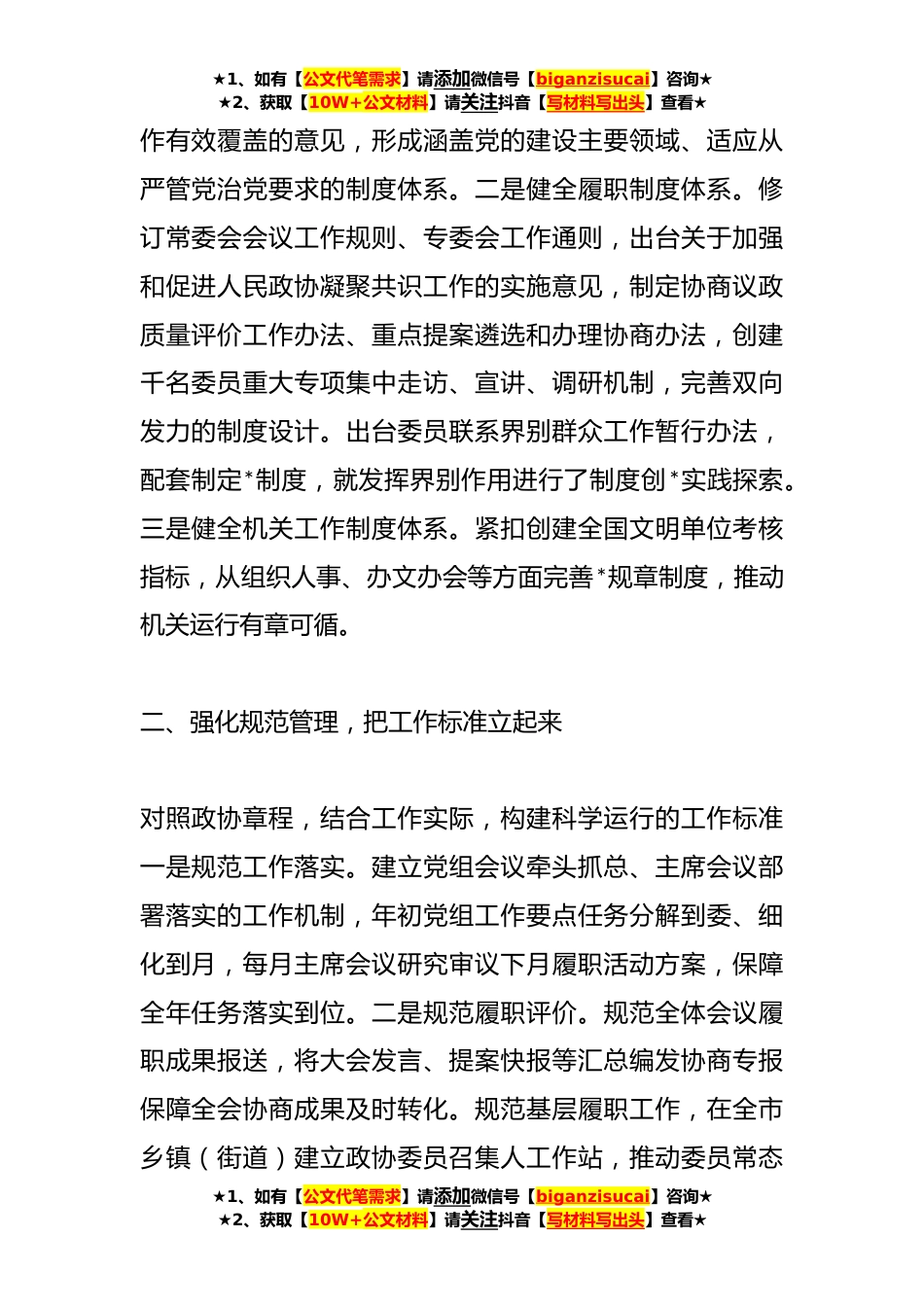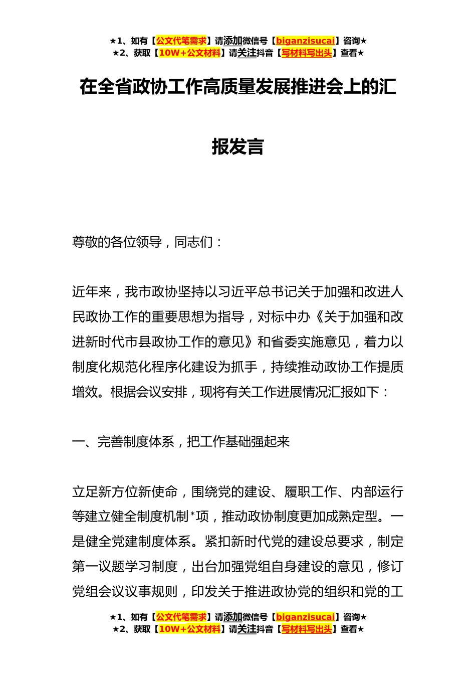 ★1、如有【公文代笔需求】请添加微信号【biganzisucai】咨询★★2、获取【10W+公文材料】请关注抖音【写材料写出头】查看★在全省政协工作高质量发展推进会上的汇报发言尊敬的各位领导,同志们:近年来,我市政协坚持以习近平总书记关于加强和改进人民政协工作的重要思想为指导,对标中办《关于加强和改进新时代市县政协工作的意见》和省委实施意见,着力以制度化规范化程序化建设为抓手,持续推动政协工作提质增效。根据会议安排,现将有关工作进展情况汇报如下:一、完善制度体系,把工作基础强起来立足新方位新使命,围绕党的建设、履职工作、内部运行等建立健全制度机制*项,推动政协制度更加成熟定型。一是健全党建制度体系。紧扣新时代党的建设总要求,制定第一议题学习制度,出台加强党组自身建设的意见,...