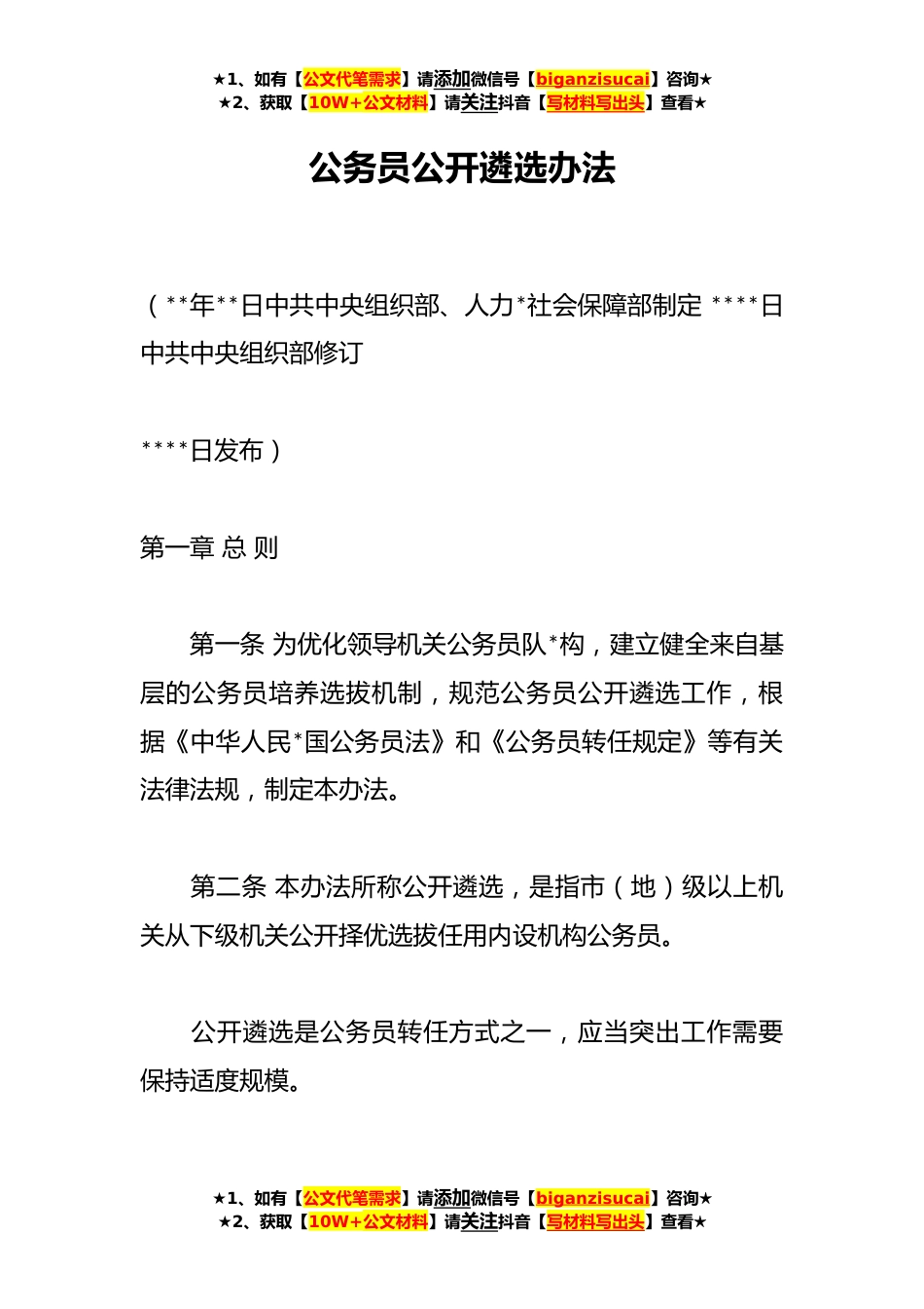 ★1、如有【公文代笔需求】请添加微信号【biganzisucai】咨询★★2、获取【10W+公文材料】请关注抖音【写材料写出头】查看★公务员公开遴选办法(**年**日中共中央组织部、人力*社会保障部制定****日中共中央组织部修订****日发布)第一章总则第一条为优化领导机关公务员队*构,建立健全来自基层的公务员培养选拔机制,规范公务员公开遴选工作,根据《中华人民*国公务员法》和《公务员转任规定》等有关法律法规,制定本办法。第二条本办法所称公开遴选,是指市(地)级以上机关从下级机关公开择优选拔任用内设机构公务员。公开遴选是公务员转任方式之一,应当突出工作需要保持适度规模。★1、如有【公文代笔需求】请添加微信号【biganzisucai】咨询★★2、获取【10W+公文材料】请关注抖音【写材料写出头】查看★★...