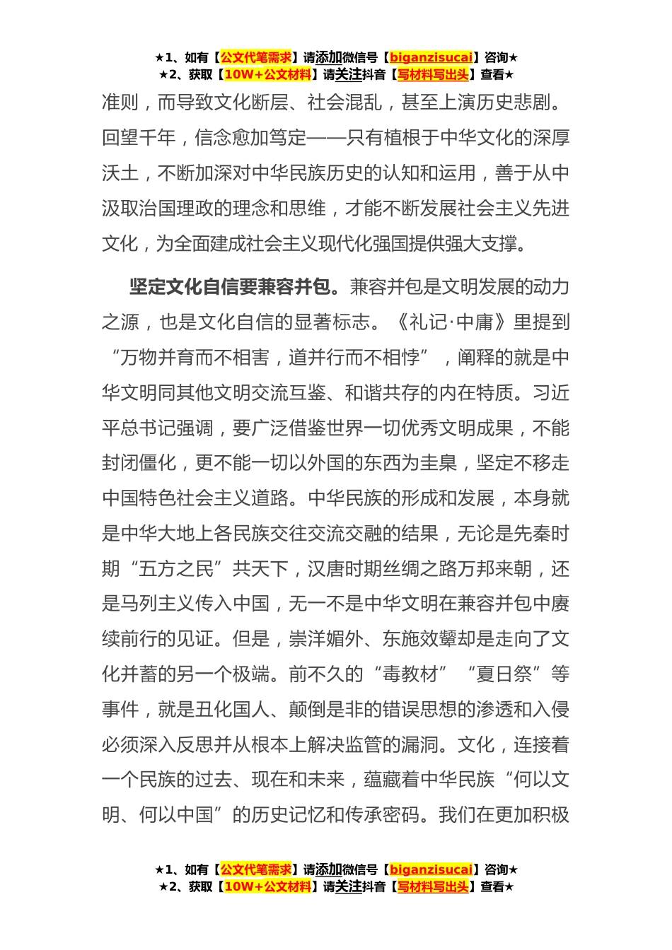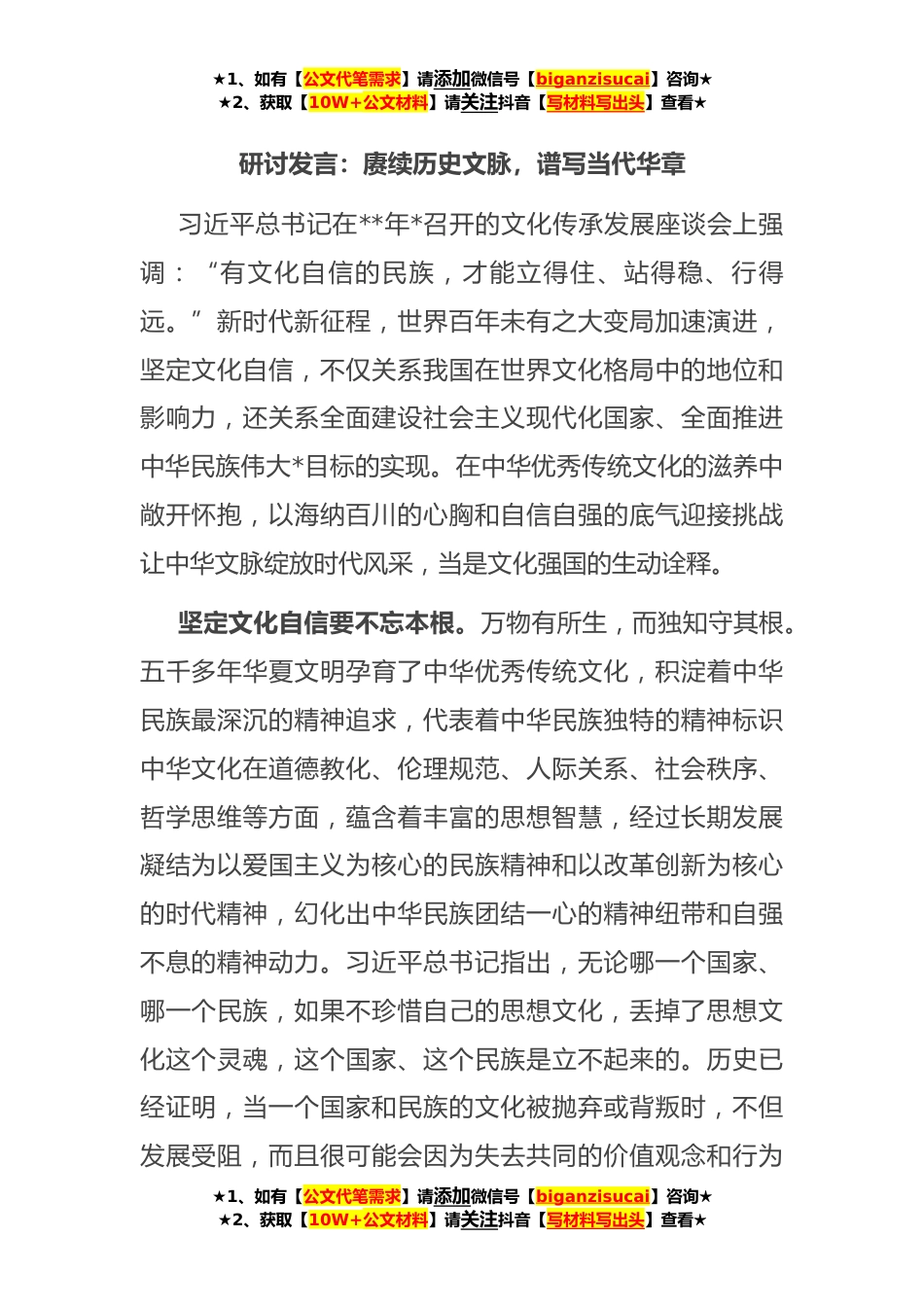 ★1、如有【公文代笔需求】请添加微信号【biganzisucai】咨询★★2、获取【10W+公文材料】请关注抖音【写材料写出头】查看★研讨发言:赓续历史文脉,谱写当代华章习近平总书记在**年*召开的文化传承发展座谈会上强调:“有文化自信的民族,才能立得住、站得稳、行得远。”新时代新征程,世界百年未有之大变局加速演进,坚定文化自信,不仅关系我国在世界文化格局中的地位和影响力,还关系全面建设社会主义现代化国家、全面推进中华民族伟大*目标的实现。在中华优秀传统文化的滋养中敞开怀抱,以海纳百川的心胸和自信自强的底气迎接挑战让中华文脉绽放时代风采,当是文化强国的生动诠释。坚定文化自信要不忘本根。万物有所生,而独知守其根。五千多年华夏文明孕育了中华优秀传统文化,积淀着中华民族最深沉的精神...