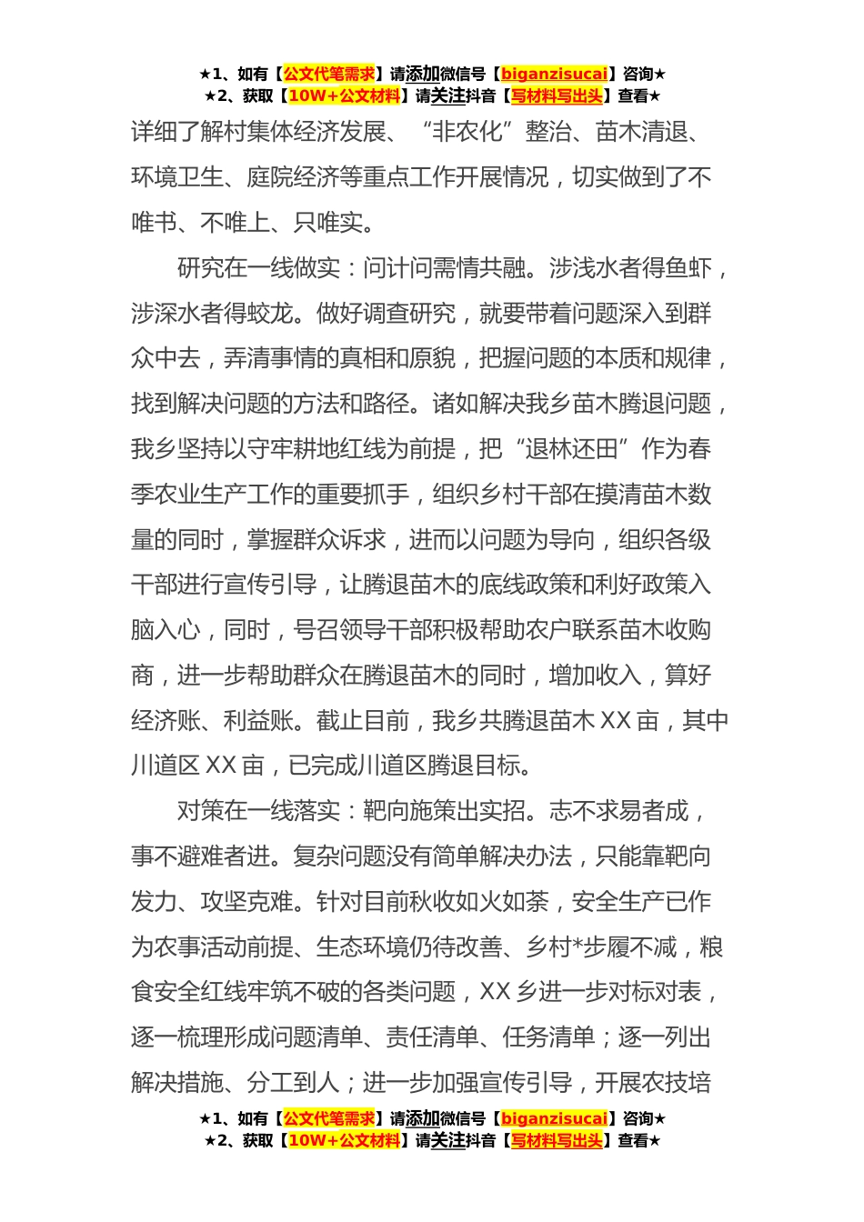 ★1、如有【公文代笔需求】请添加微信号【biganzisucai】咨询★★2、获取【10W+公文材料】请关注抖音【写材料写出头】查看★*调查研究之风研讨材料今年,是全面贯彻党的XX大精神开局之年,是向第二个百年历史目标进发的关键时期,中共中央办公厅印发的《关于在全党*调查研究的工作方案》,恰逢其时、意义重大、影响深远。回顾我党的发展历程,《中国社会各阶级的分析》《*农民运动考察报告》《*调查》《反对本本主义》……党史上这些历久弥新、至今仍熠熠生辉的经典名篇,无不建立在深入调查研究的基础上。总书记强调,调查研究是谋事之基、成事之道。作为新时代领导干部,我们更应延续我党的优秀传统,领会要义,结合“三个年”的行动目标,扑下身子干实事、谋实招、求实效,真正做到“调”以务实、“研”以致用...