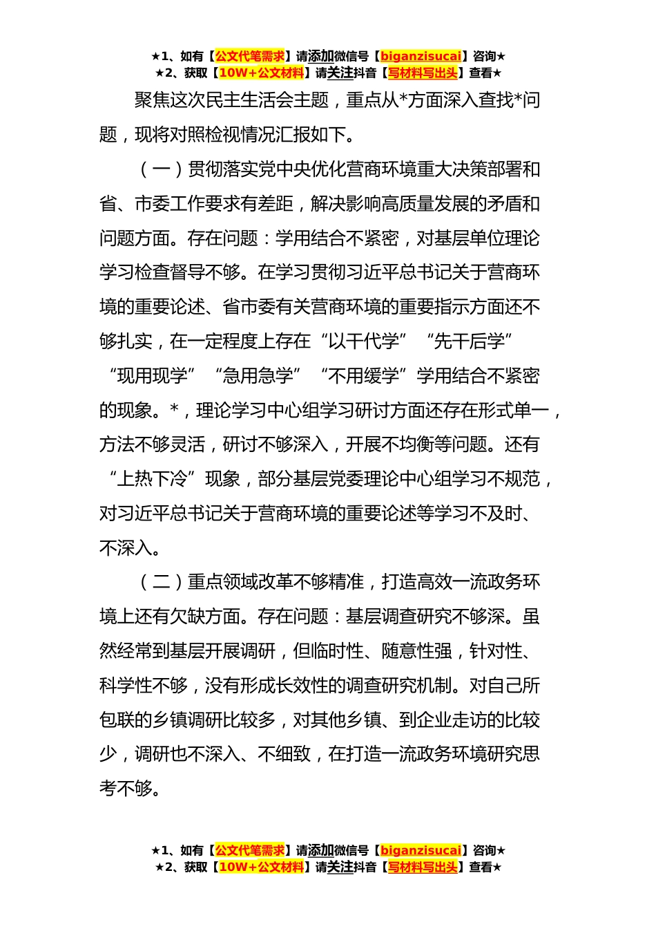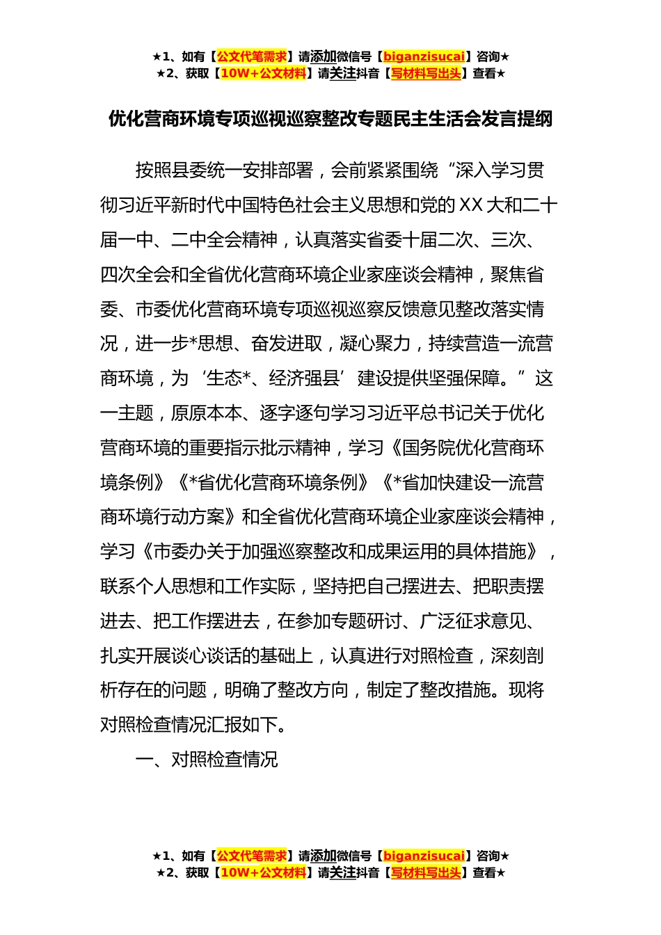 ★1、如有【公文代笔需求】请添加微信号【biganzisucai】咨询★★2、获取【10W+公文材料】请关注抖音【写材料写出头】查看★优化营商环境专项巡视巡察整改专题民主生活会发言提纲按照县委统一安排部署,会前紧紧围绕“深入学习贯彻习近平新时代中国特色社会主义思想和党的XX大和二十届一中、二中全会精神,认真落实省委十届二次、三次、四次全会和全省优化营商环境企业家座谈会精神,聚焦省委、市委优化营商环境专项巡视巡察反馈意见整改落实情况,进一步*思想、奋发进取,凝心聚力,持续营造一流营商环境,为‘生态*、经济强县’建设提供坚强保障。”这一主题,原原本本、逐字逐句学习习近平总书记关于优化营商环境的重要指示批示精神,学习《国务院优化营商环境条例》《*省优化营商环境条例》《*省加快建设一流...