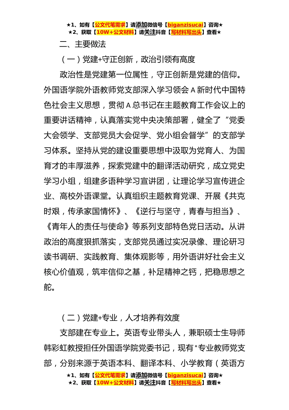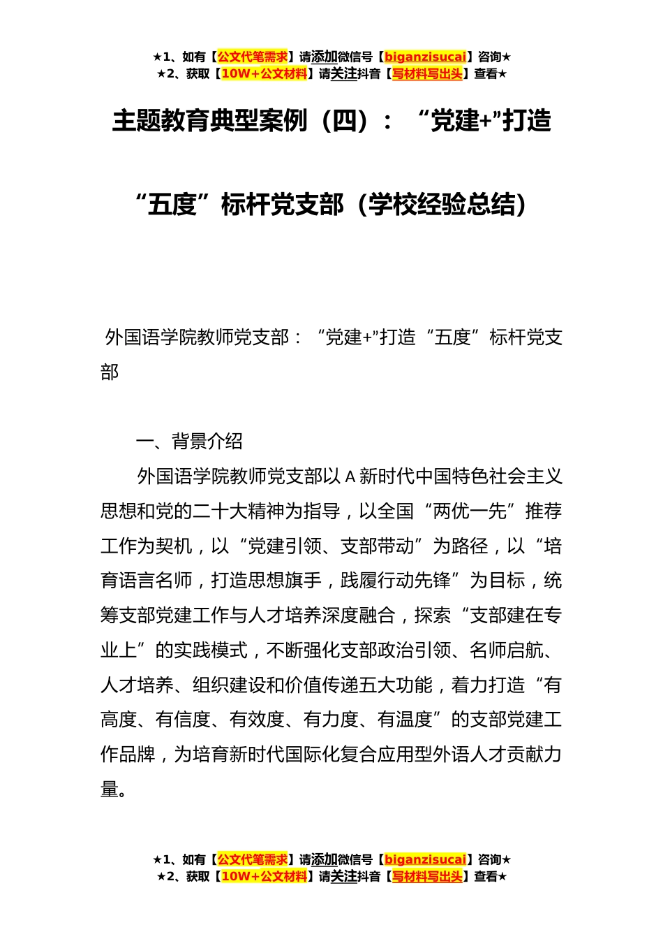 ★1、如有【公文代笔需求】请添加微信号【biganzisucai】咨询★★2、获取【10W+公文材料】请关注抖音【写材料写出头】查看★主题教育典型案例(四):“党建+”打造“五度”标杆党支部(学校经验总结)外国语学院教师党支部:“党建+”打造“五度”标杆党支部一、背景介绍外国语学院教师党支部以A新时代中国特色社会主义思想和党的二十大精神为指导,以全国“两优一先”推荐工作为契机,以“党建引领、支部带动”为路径,以“培育语言名师,打造思想旗手,践履行动先锋”为目标,统筹支部党建工作与人才培养深度融合,探索“支部建在专业上”的实践模式,不断强化支部政治引领、名师启航、人才培养、组织建设和价值传递五大功能,着力打造“有高度、有信度、有效度、有力度、有温度”的支部党建工作品牌,为培育新...