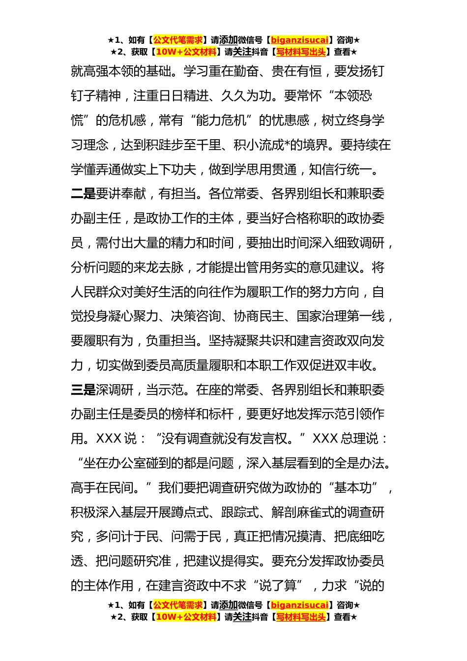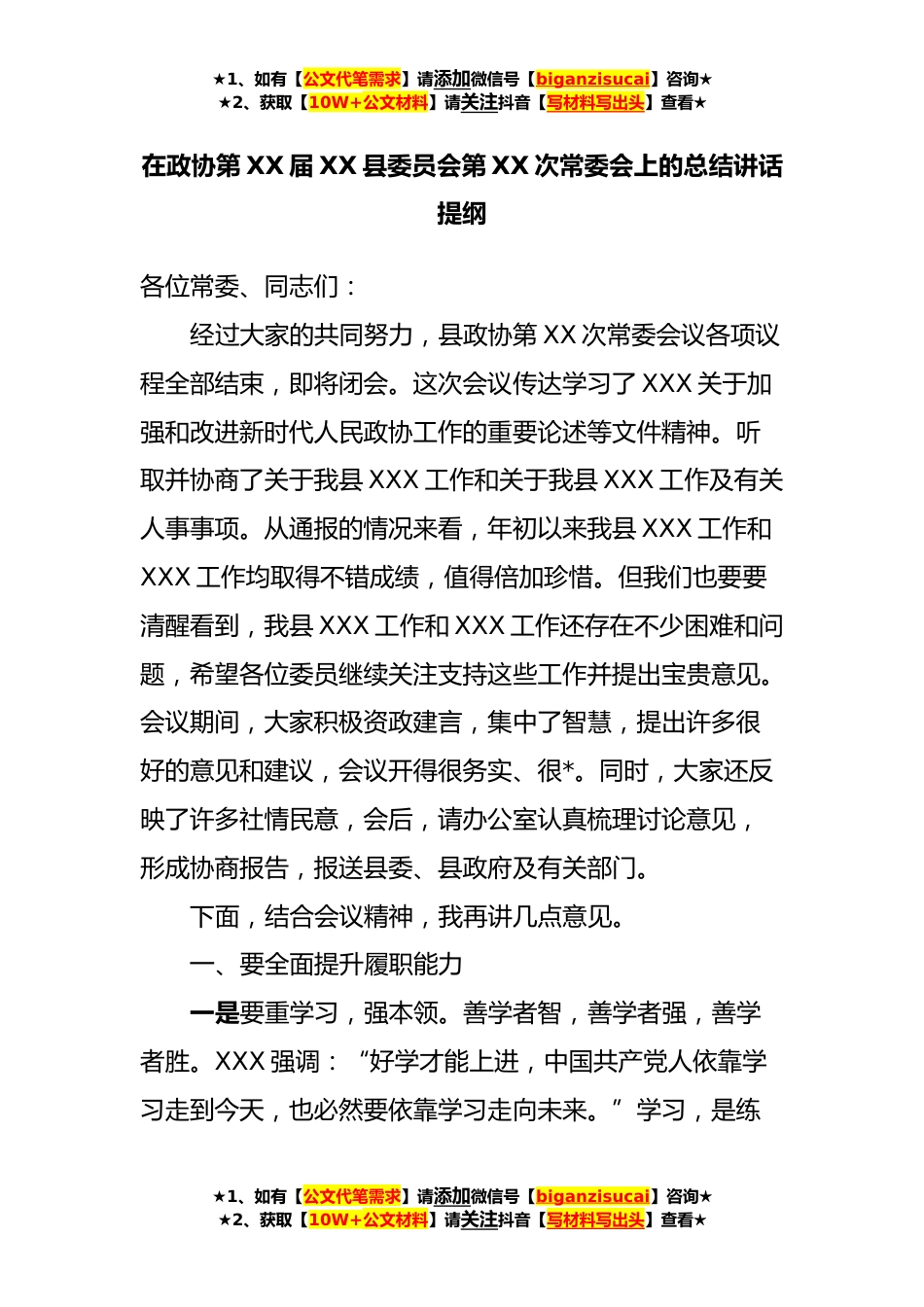 ★1、如有【公文代笔需求】请添加微信号【biganzisucai】咨询★★2、获取【10W+公文材料】请关注抖音【写材料写出头】查看★在政协第XX届XX县委员会第XX次常委会上的总结讲话提纲各位常委、同志们:经过大家的共同努力,县政协第XX次常委会议各项议程全部结束,即将闭会。这次会议传达学习了XXX关于加强和改进新时代人民政协工作的重要论述等文件精神。听取并协商了关于我县XXX工作和关于我县XXX工作及有关人事事项。从通报的情况来看,年初以来我县XXX工作和XXX工作均取得不错成绩,值得倍加珍惜。但我们也要要清醒看到,我县XXX工作和XXX工作还存在不少困难和问题,希望各位委员继续关注支持这些工作并提出宝贵意见。会议期间,大家积极资政建言,集中了智慧,提出许多很好的意见和建议,会议开得很务实、很*。...