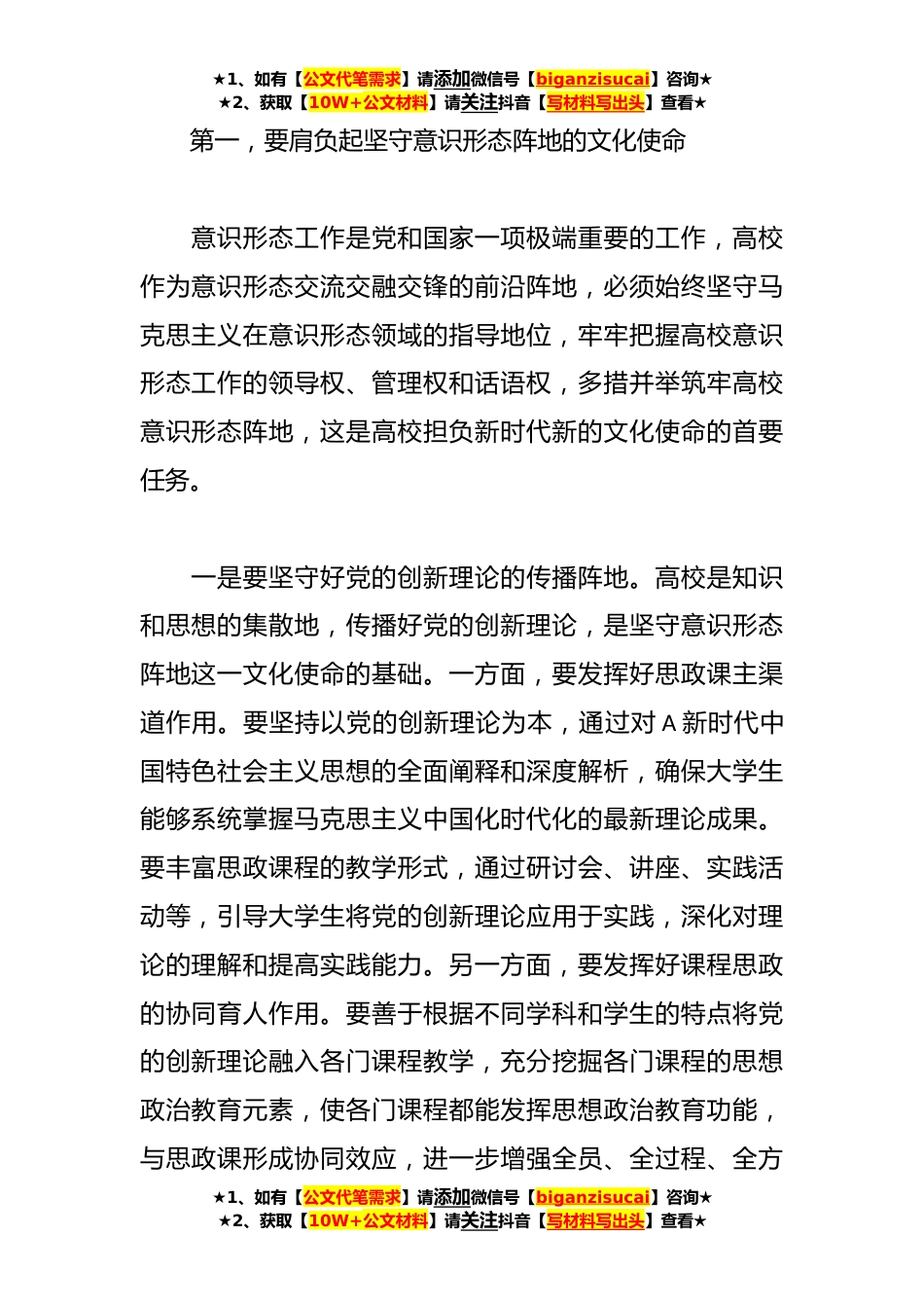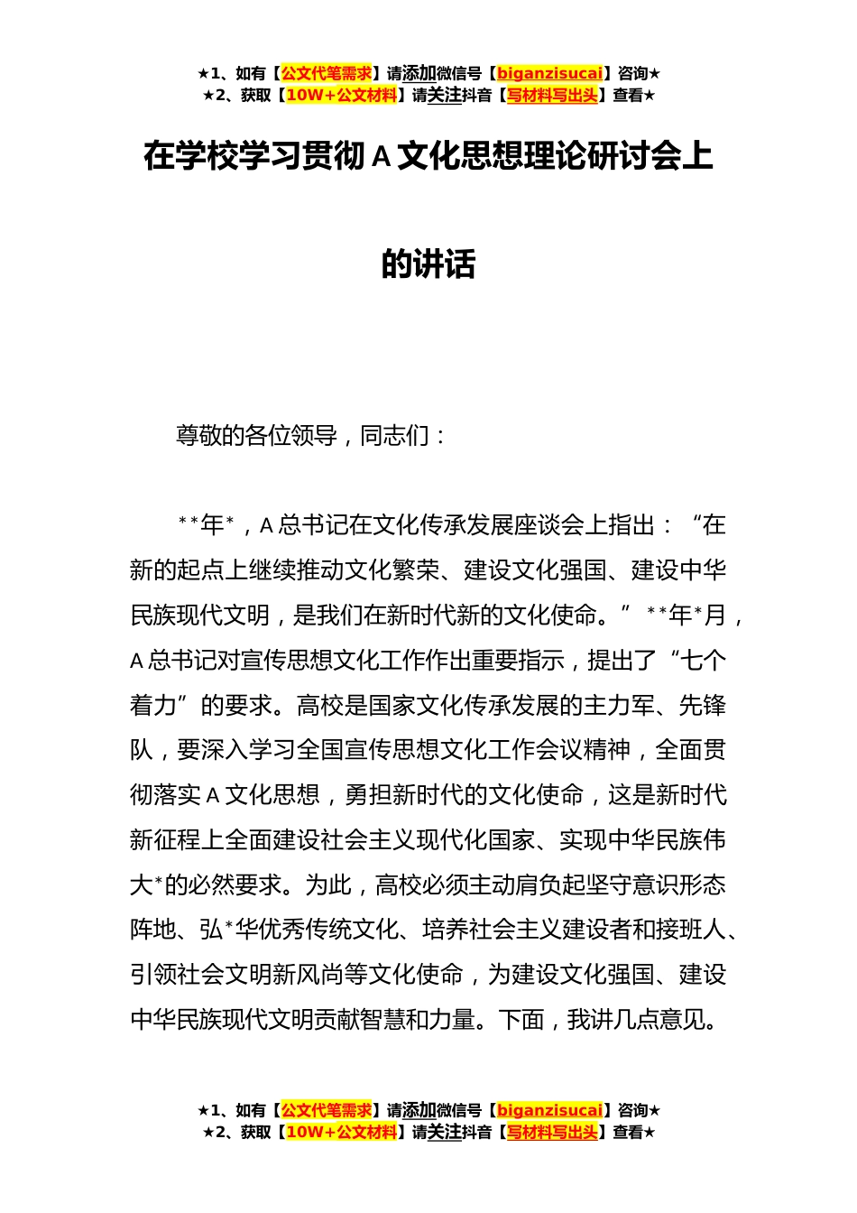 ★1、如有【公文代笔需求】请添加微信号【biganzisucai】咨询★★2、获取【10W+公文材料】请关注抖音【写材料写出头】查看★在学校学习贯彻A文化思想理论研讨会上的讲话尊敬的各位领导,同志们:**年*,A总书记在文化传承发展座谈会上指出:“在新的起点上继续推动文化繁荣、建设文化强国、建设中华民族现代文明,是我们在新时代新的文化使命。”**年*月,A总书记对宣传思想文化工作作出重要指示,提出了“七个着力”的要求。高校是国家文化传承发展的主力军、先锋队,要深入学习全国宣传思想文化工作会议精神,全面贯彻落实A文化思想,勇担新时代的文化使命,这是新时代新征程上全面建设社会主义现代化国家、实现中华民族伟大*的必然要求。为此,高校必须主动肩负起坚守意识形态阵地、弘*华优秀传统文化、培养社...