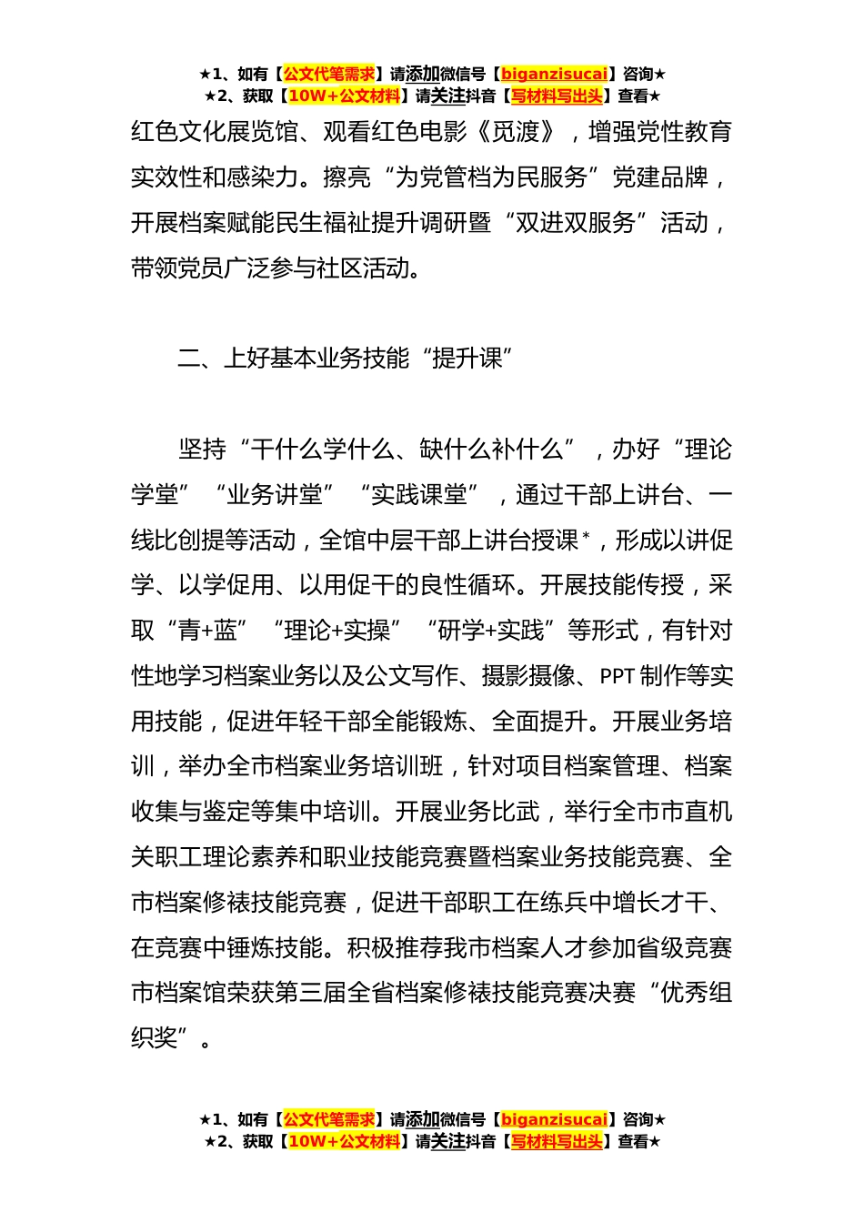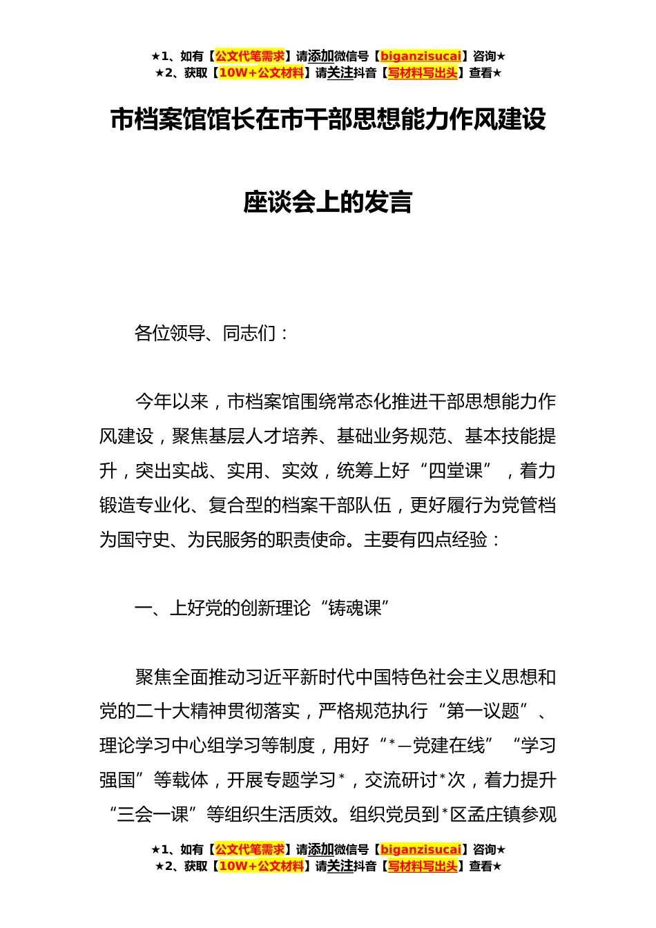 ★1、如有【公文代笔需求】请添加微信号【biganzisucai】咨询★★2、获取【10W+公文材料】请关注抖音【写材料写出头】查看★市档案馆馆长在市干部思想能力作风建设座谈会上的发言各位领导、同志们:今年以来,市档案馆围绕常态化推进干部思想能力作风建设,聚焦基层人才培养、基础业务规范、基本技能提升,突出实战、实用、实效,统筹上好“四堂课”,着力锻造专业化、复合型的档案干部队伍,更好履行为党管档为国守史、为民服务的职责使命。主要有四点经验:一、上好党的创新理论“铸魂课”聚焦全面推动习近平新时代中国特色社会主义思想和党的二十大精神贯彻落实,严格规范执行“第一议题”、理论学习中心组学习等制度,用好“*—党建在线”“学习强国”等载体,开展专题学习*,交流研讨*次,着力提升“三会一课...