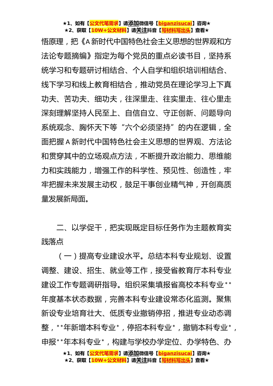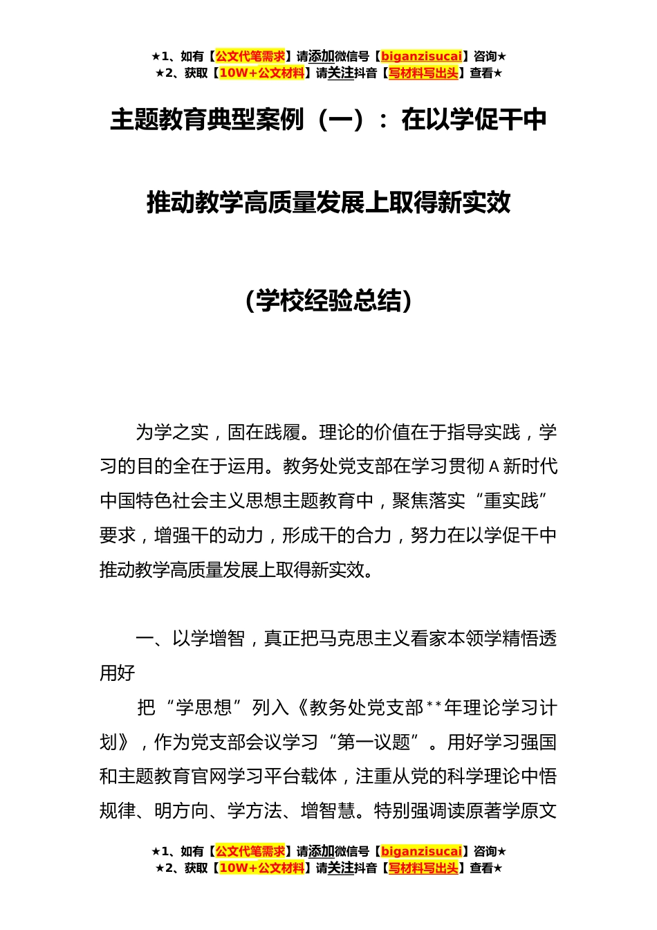 ★1、如有【公文代笔需求】请添加微信号【biganzisucai】咨询★★2、获取【10W+公文材料】请关注抖音【写材料写出头】查看★主题教育典型案例(一):在以学促干中推动教学高质量发展上取得新实效(学校经验总结)为学之实,固在践履。理论的价值在于指导实践,学习的目的全在于运用。教务处党支部在学习贯彻A新时代中国特色社会主义思想主题教育中,聚焦落实“重实践”要求,增强干的动力,形成干的合力,努力在以学促干中推动教学高质量发展上取得新实效。一、以学增智,真正把马克思主义看家本领学精悟透用好把“学思想”列入《教务处党支部**年理论学习计划》,作为党支部会议学习“第一议题”。用好学习强国和主题教育官网学习平台载体,注重从党的科学理论中悟规律、明方向、学方法、增智慧。特别强调读原著...