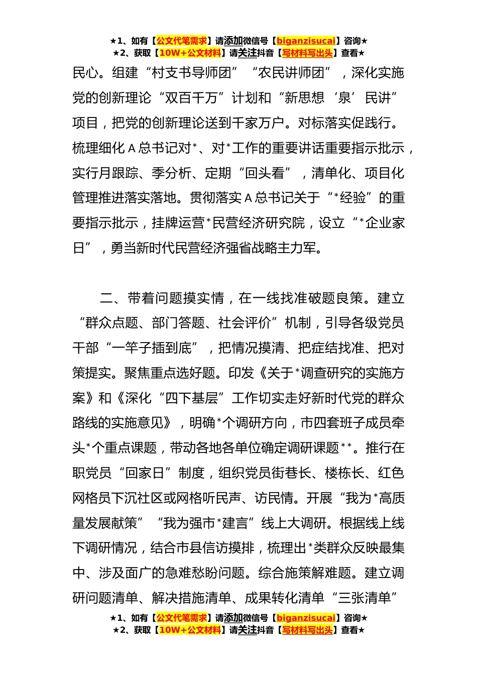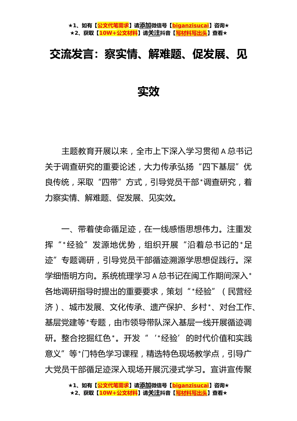 ★1、如有【公文代笔需求】请添加微信号【biganzisucai】咨询★★2、获取【10W+公文材料】请关注抖音【写材料写出头】查看★交流发言:察实情、解难题、促发展、见实效主题教育开展以来,全市上下深入学习贯彻A总书记关于调查研究的重要论述,大力传承弘扬“四下基层”优良传统,采取“四带”方式,引导党员干部*调查研究,着力察实情、解难题、促发展、见实效。一、带着使命循足迹,在一线感悟思想伟力。注重发挥“*经验”发源地优势,组织开展“沿着总书记的*足迹”专题调研,引导党员干部循迹溯源学思想促践行。深学细悟明方向。系统梳理学习A总书记在闽工作期间深入*各地调研指导时提出的重要要求,策划“*经验”(民营经济)、城市发展、文化传承、遗产保护、乡村*、对台工作、基层党建等*专题,由市领导带队...