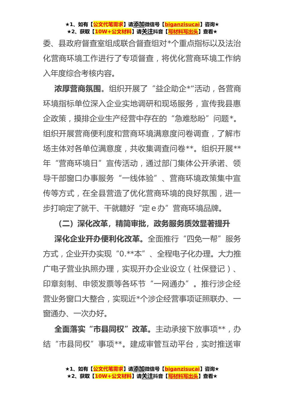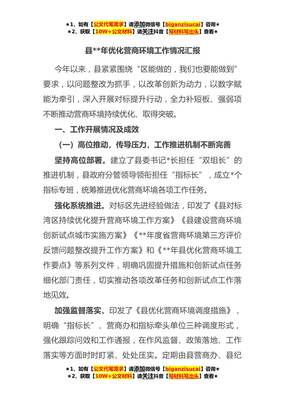 ★1、如有【公文代笔需求】请添加微信号【biganzisucai】咨询★★2、获取【10W+公文材料】请关注抖音【写材料写出头】查看★县**年优化营商环境工作情况汇报今年以来,县紧紧围绕“区能做的,我们也要能做到”要求,以问题整改为抓手,以改革创新为动力,以数字赋能为牵引,深入开展对标提升行动,全力补短板、强弱项不断推动营商环境持续优化、取得突破。一、工作开展情况及成效(一)高位推动,传导压力,工作推进机制不断完善坚持高位部署。建立了县委书记*长担任“双组长”的推进机制,县政府分管领导领衔担任“指标长”,成立*个指标专班,统筹推进优化营商环境各项工作任务。强化系统推进。对标区先进经验做法,印发了《县对标湾区持续优化提升营商环境工作方案》《县建设营商环境创新试点城市实施方案》《*...
