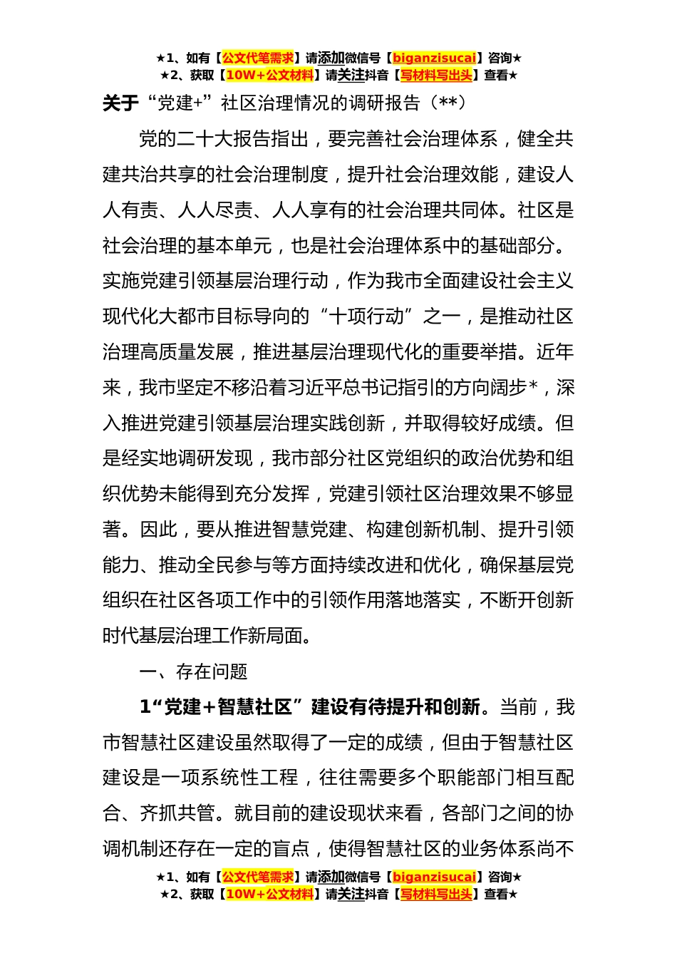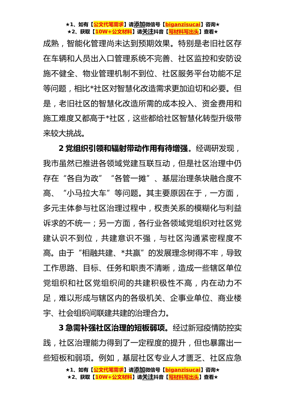 ★1、如有【公文代笔需求】请添加微信号【biganzisucai】咨询★★2、获取【10W+公文材料】请关注抖音【写材料写出头】查看★关于“党建+”社区治理情况的调研报告(**)党的二十大报告指出,要完善社会治理体系,健全共建共治共享的社会治理制度,提升社会治理效能,建设人人有责、人人尽责、人人享有的社会治理共同体。社区是社会治理的基本单元,也是社会治理体系中的基础部分。实施党建引领基层治理行动,作为我市全面建设社会主义现代化大都市目标导向的“十项行动”之一,是推动社区治理高质量发展,推进基层治理现代化的重要举措。近年来,我市坚定不移沿着习近平总书记指引的方向阔步*,深入推进党建引领基层治理实践创新,并取得较好成绩。但是经实地调研发现,我市部分社区党组织的政治优势和组织优势未...