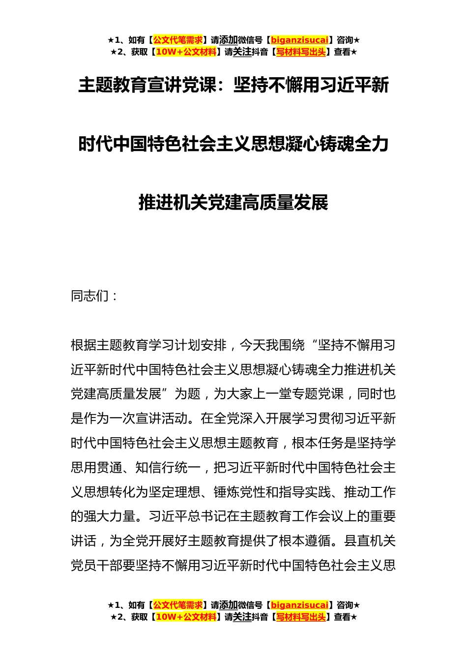 ★1、如有【公文代笔需求】请添加微信号【biganzisucai】咨询★★2、获取【10W+公文材料】请关注抖音【写材料写出头】查看★主题教育宣讲党课:坚持不懈用习近平新时代中国特色社会主义思想凝心铸魂全力推进机关党建高质量发展同志们:根据主题教育学习计划安排,今天我围绕“坚持不懈用习近平新时代中国特色社会主义思想凝心铸魂全力推进机关党建高质量发展”为题,为大家上一堂专题党课,同时也是作为一次宣讲活动。在全党深入开展学习贯彻习近平新时代中国特色社会主义思想主题教育,根本任务是坚持学思用贯通、知信行统一,把习近平新时代中国特色社会主义思想转化为坚定理想、锤炼党性和指导实践、推动工作的强大力量。习近平总书记在主题教育工作会议上的重要讲话,为全党开展好主题教育提供了根本遵循。县...