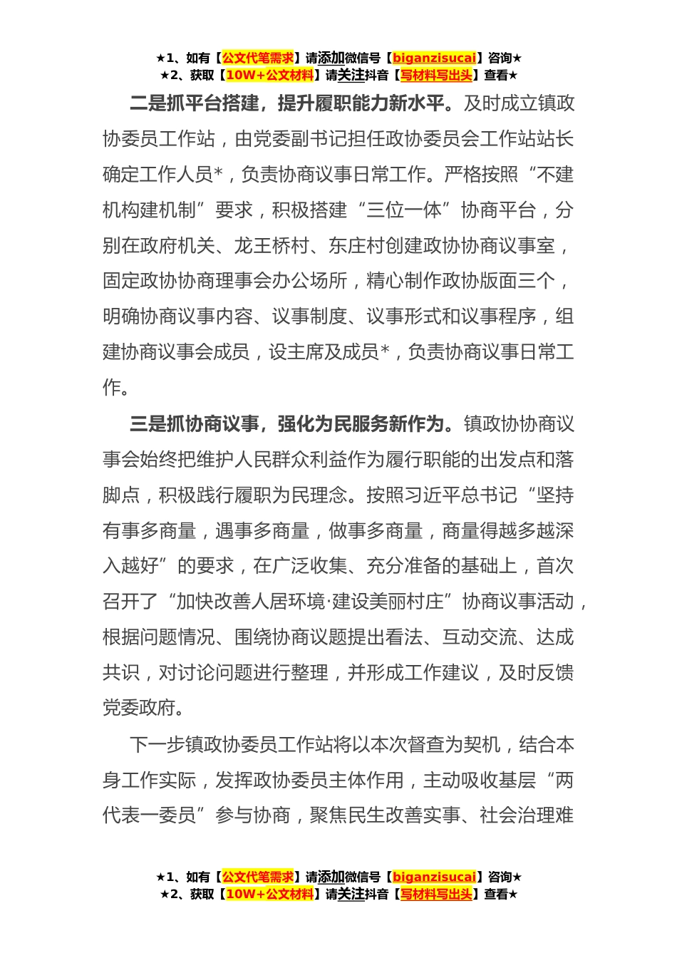 ★1、如有【公文代笔需求】请添加微信号【biganzisucai】咨询★★2、获取【10W+公文材料】请关注抖音【写材料写出头】查看★镇**年政协工作汇报今年以来,在县政协的精心指导下,紧紧围绕镇党委、政府确定的目标任务和工作重点,充分发挥协商重要渠道和机构作用,着力强化共同思想政治基础,尽心助推经济发展,真情关注民生福祉,聚力促进社会和谐,从严加强自身建设,全力做好基层政协联络服务基层群众“最后一公里”,展现新时代基层政协履职新气象。一是抓理论学习,凝聚思想共识新成效。坚持以习近平新时代中国特色社会主义思想为指导,深入学习贯彻习近平总书记关于加强和改进人民政协工作的重要思想,全面贯彻落实中央和省市县委政协工作会议精神,组织协商议事会成员认真学习人民政协和统一战线理论,按照...