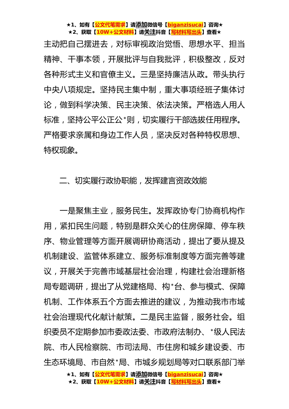 ★1、如有【公文代笔需求】请添加微信号【biganzisucai】咨询★★2、获取【10W+公文材料】请关注抖音【写材料写出头】查看★市政协副主席年终总结述职报告一、不断加强自身建设,切实增强干事创业的本领和热情一是加强思想政治建设。我始终将提高政治站位、强化理论学习作为工作的重要组成部分和提高自身修养、整体素质的重要途径,系统学习习近平新时代中国特色社会主义思想,特别是重点学习了习近平总书记对我省重要讲话重要指示批示精神,深入钻研党的创新理论,努力在政治和全局上把握党的路线、方针、政策,不断提高观察和分析问题能力,增强政治判断力、政治领悟力、政治执行力;深入基层宣传二十大精神,宣传的党课视频荣获市级党的二十大宣传党课二等奖,在全市机关干部理论培训班上播放。全年组织中心组...