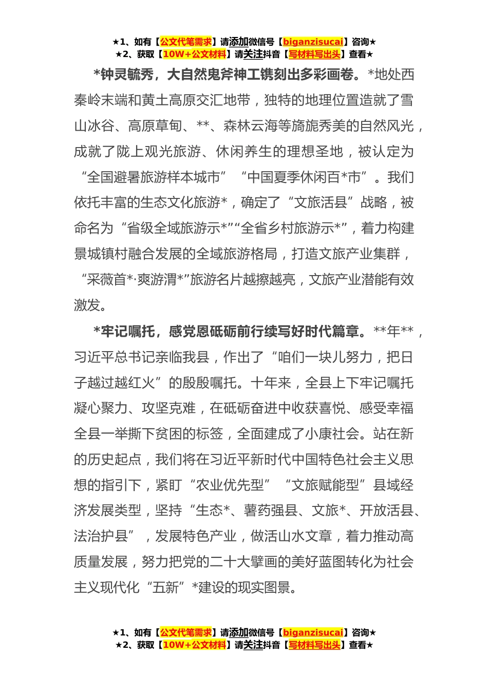 ★1、如有【公文代笔需求】请添加微信号【biganzisucai】咨询★★2、获取【10W+公文材料】请关注抖音【写材料写出头】查看★在县第五届文化旅游节开幕式上的致辞尊敬的各位领导、各位*,同志们、朋友们,父老乡亲们:大家上午好!我县举浪诚邀四海宾朋,首阳揽翠喜迎八方来客。今天我们如期相约渭水源头、相聚首*下,隆重举行第五届文化旅游节开幕式,在此,我谨代表县委、县人大常委会、县人民政府、县政协和*万渭河儿女,向莅临开幕式的各位领导、各位*表示热烈的欢迎!向长期以来关心和支持*发展的各界人士表示衷心的感谢!向全县父老乡亲们致以亲切的问候*好的祝愿!*因源而起,五千年华夏文明闪耀着璀璨光芒。《尚书·禹贡》记载:天下分为九州,*处古雍州之地。古老的渭河,滥觞于鸟鼠山品字泉,流淌出华夏...