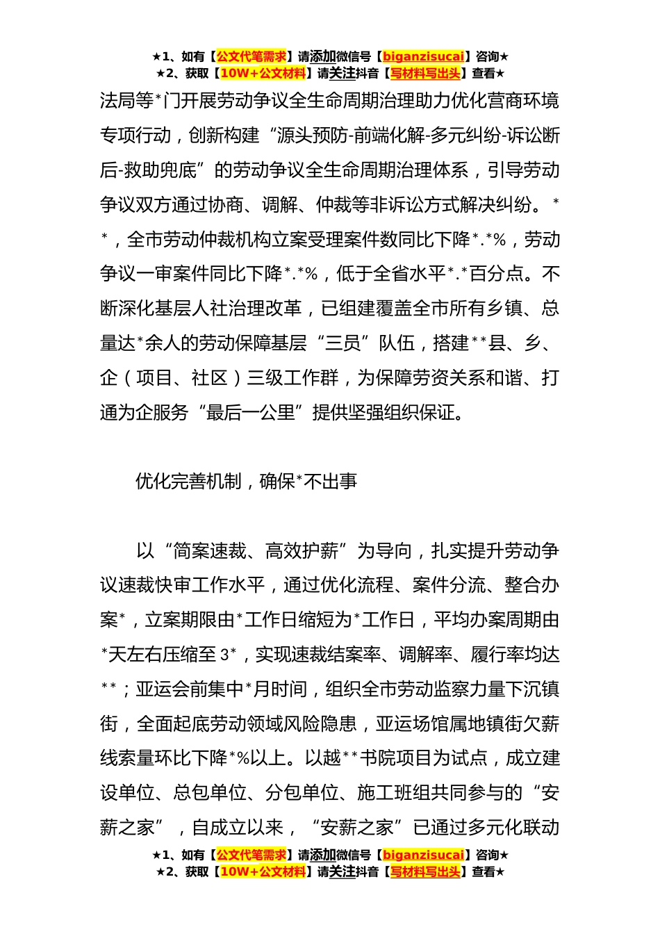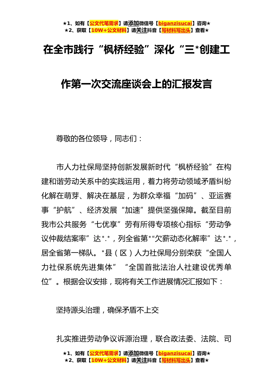 ★1、如有【公文代笔需求】请添加微信号【biganzisucai】咨询★★2、获取【10W+公文材料】请关注抖音【写材料写出头】查看★在全市践行“枫桥经验”深化“三*创建工作第一次交流座谈会上的汇报发言尊敬的各位领导,同志们:市人力社保局坚持创新发展新时代“枫桥经验”在构建和谐劳动关系中的实践运用,着力将劳动领域矛盾纠纷化解在萌芽、解决在基层,为群众幸福“加码”、亚运赛事“护航”、经济发展“加速”提供坚强保障。截至目前我市公共服务“七优享”劳有所得专项核心指标“劳动争议仲裁结案率”达*.*,列全省第*“欠薪动态化解率”达*.*,居全省第一梯队。*县(区)人力社保局分别荣获“全国人力社保系统先进集体”“全国首批法治人社建设优秀单位”。根据会议安排,现将有关工作进展情况汇报如下:坚持源...