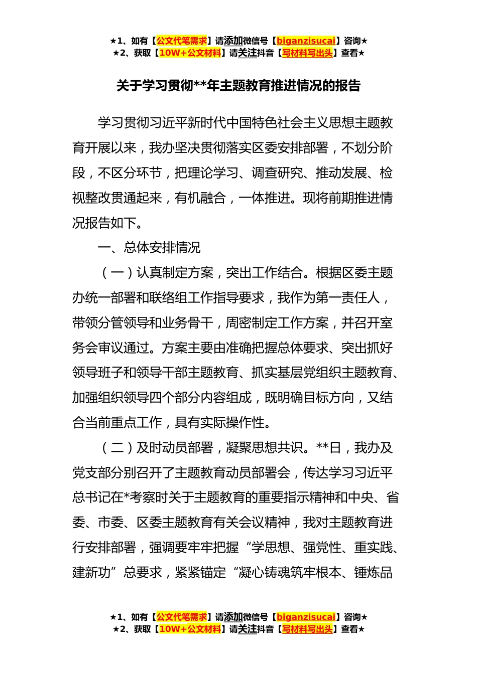 ★1、如有【公文代笔需求】请添加微信号【biganzisucai】咨询★★2、获取【10W+公文材料】请关注抖音【写材料写出头】查看★关于学习贯彻**年主题教育推进情况的报告学习贯彻习近平新时代中国特色社会主义思想主题教育开展以来,我办坚决贯彻落实区委安排部署,不划分阶段,不区分环节,把理论学习、调查研究、推动发展、检视整改贯通起来,有机融合,一体推进。现将前期推进情况报告如下。一、总体安排情况(一)认真制定方案,突出工作结合。根据区委主题办统一部署和联络组工作指导要求,我作为第一责任人,带领分管领导和业务骨干,周密制定工作方案,并召开室务会审议通过。方案主要由准确把握总体要求、突出抓好领导班子和领导干部主题教育、抓实基层党组织主题教育、加强组织领导四个部分内容组成,既明确...
