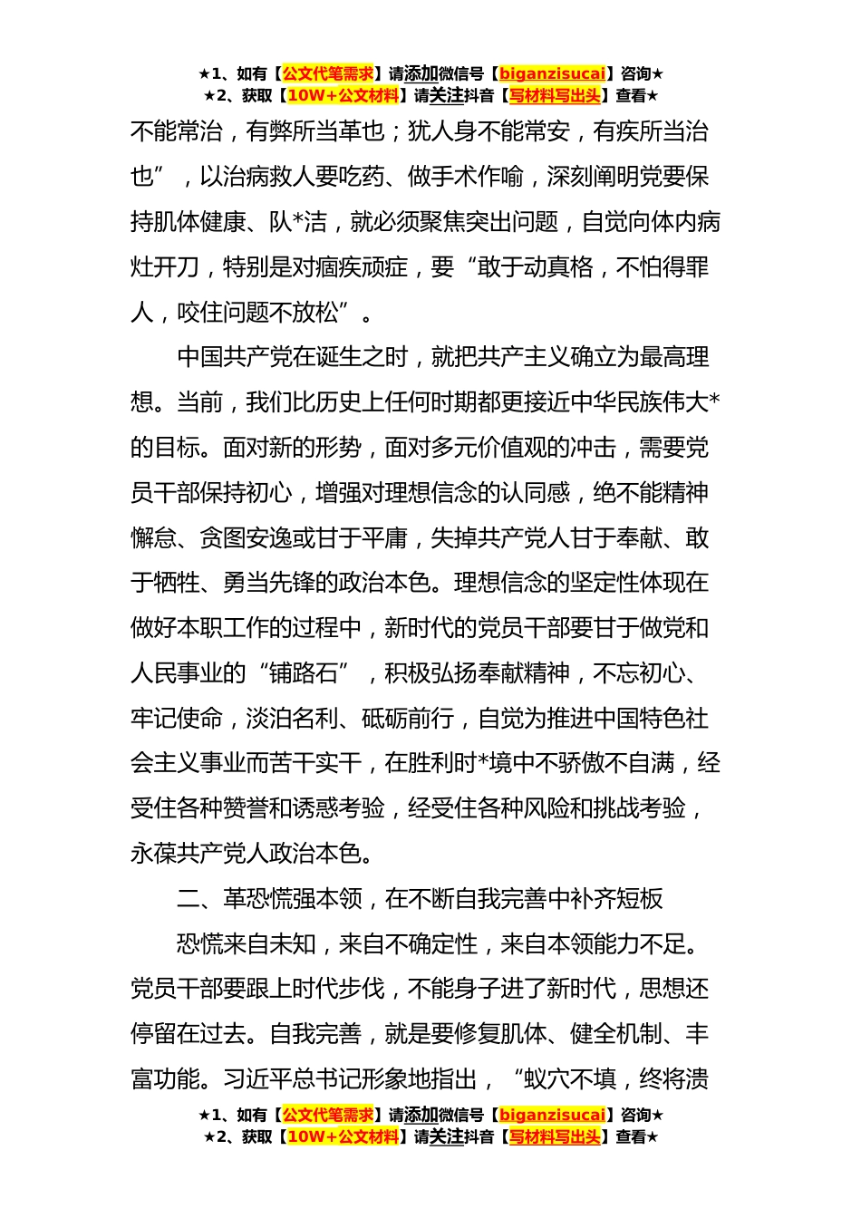 ★1、如有【公文代笔需求】请添加微信号【biganzisucai】咨询★★2、获取【10W+公文材料】请关注抖音【写材料写出头】查看★主题教育交流研讨发言提纲:纵深推进自我革命,在党性淬炼中砥砺成长习近平总书记指出,在进行社会革命的同时不断进行自我革命,是我们党区别于其他政党最显著的标志,也是我们党不断从胜利走向新的胜利的关键所在。党的XX大报告提出,全面从严治党永远在路上,党的自我革命永远在路上,决不能有松劲歇脚、疲劳厌战的情绪。勇于自我革命是我们党的鲜明品格,也是党员干部的成长之道。党员干部的先进纯洁不是天生的,而是在不断自我革命中淬炼而成的。踏上新的赶考之路,必须不断进行自我革命,同一切影响党的先进性、弱化党的纯洁性的问题作坚决斗争,实现自我净化、自我完善、自我革新、...