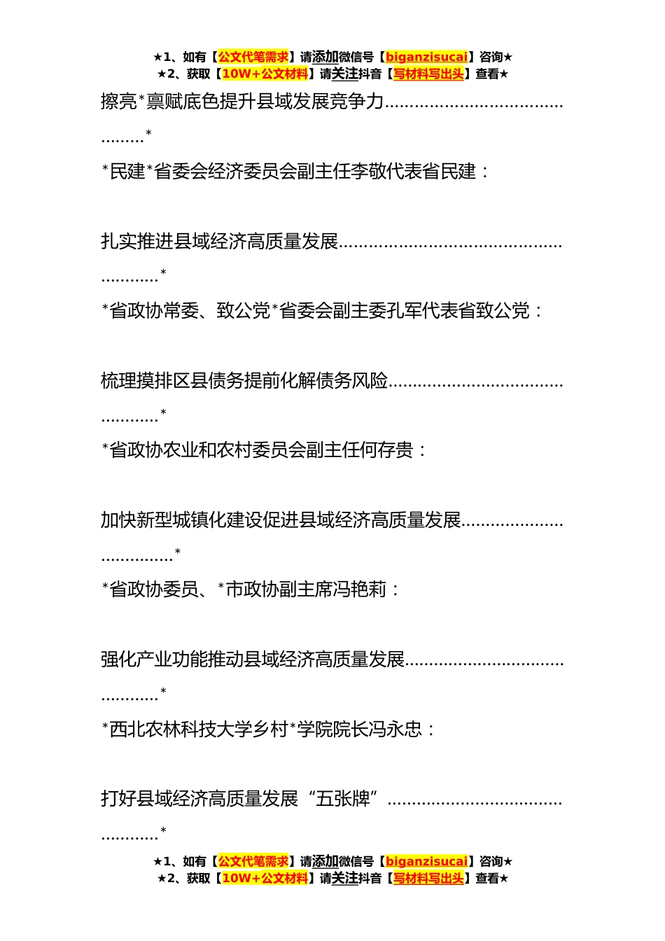 ★1、如有【公文代笔需求】请添加微信号【biganzisucai】咨询★★2、获取【10W+公文材料】请关注抖音【写材料写出头】查看★*省政协“提升县域经济发展水平”专题协商会发言材料汇编(*)目录**市政协副主席高苗代表市政协:统筹谋划引领产业*上下联动提升县域实力………………………………**省政协委员、*市政协主席王宁岗代表市政协:★1、如有【公文代笔需求】请添加微信号【biganzisucai】咨询★★2、获取【10W+公文材料】请关注抖音【写材料写出头】查看★★1、如有【公文代笔需求】请添加微信号【biganzisucai】咨询★★2、获取【10W+公文材料】请关注抖音【写材料写出头】查看★擦亮*禀赋底色提升县域发展竞争力………………………………………**民建*省委会经济委员会副主任李敬代表省民建:扎实推进县域...
