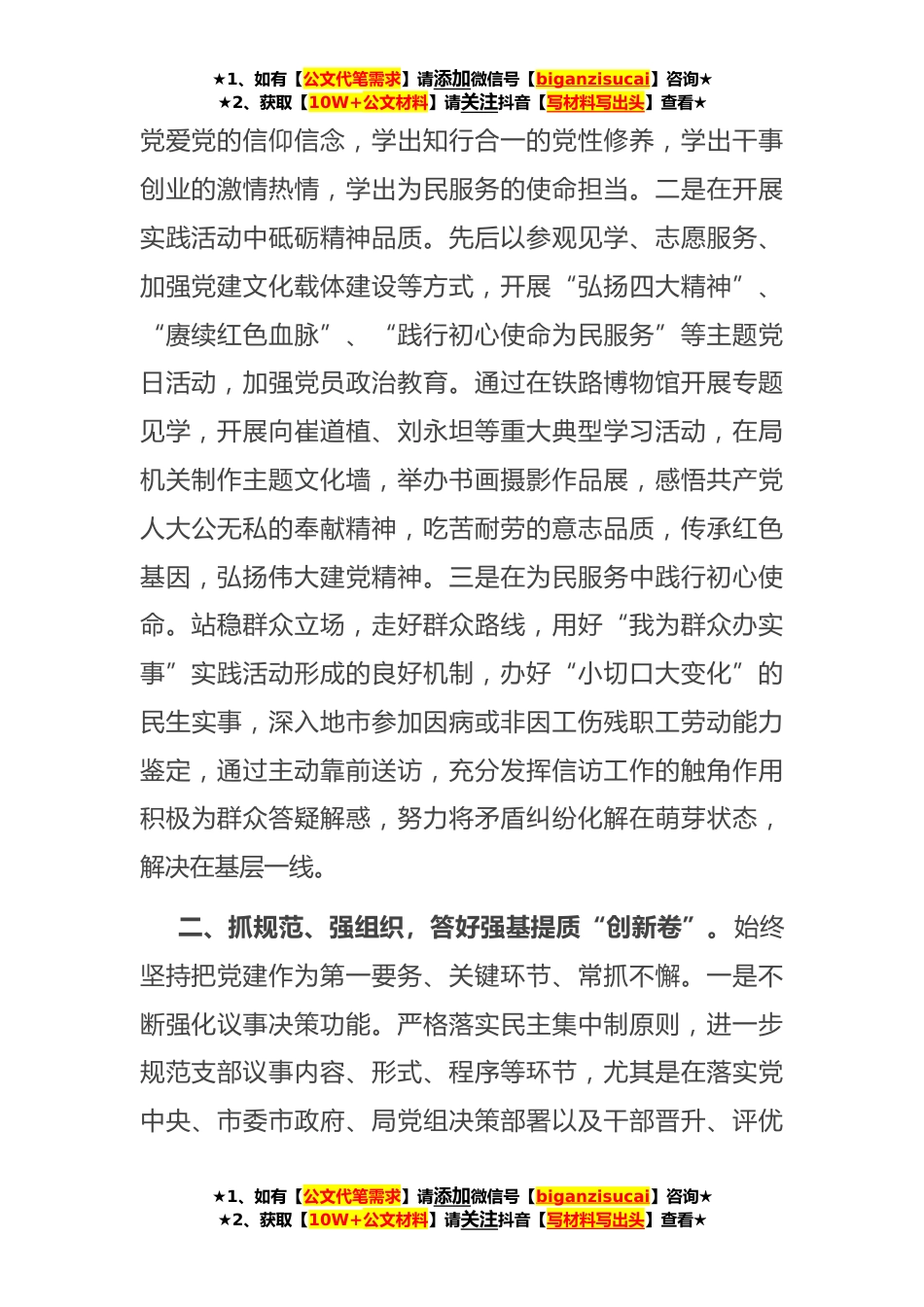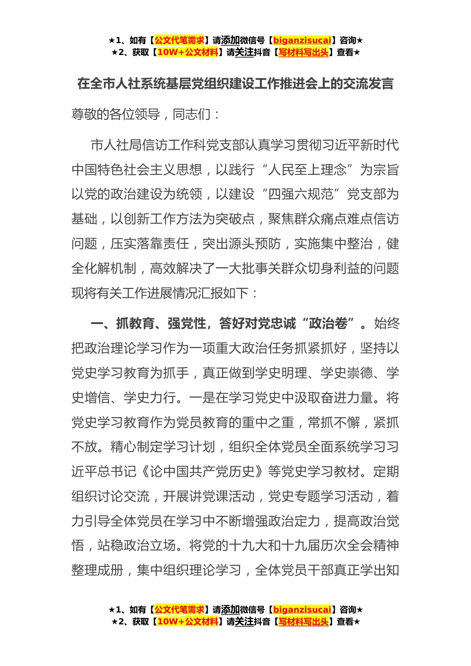 ★1、如有【公文代笔需求】请添加微信号【biganzisucai】咨询★★2、获取【10W+公文材料】请关注抖音【写材料写出头】查看★在全市人社系统基层党组织建设工作推进会上的交流发言尊敬的各位领导,同志们:市人社局信访工作科党支部认真学习贯彻习近平新时代中国特色社会主义思想,以践行“人民至上理念”为宗旨以党的政治建设为统领,以建设“四强六规范”党支部为基础,以创新工作方法为突破点,聚焦群众痛点难点信访问题,压实落靠责任,突出源头预防,实施集中整治,健全化解机制,高效解决了一大批事关群众切身利益的问题现将有关工作进展情况汇报如下:一、抓教育、强党性,答好对党忠诚“政治卷”。始终把政治理论学习作为一项重大政治任务抓紧抓好,坚持以党史学习教育为抓手,真正做到学史明理、学史崇德...