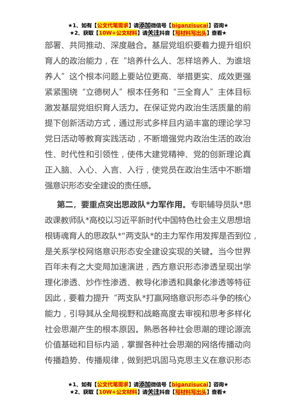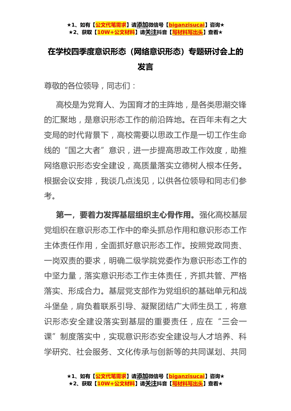 ★1、如有【公文代笔需求】请添加微信号【biganzisucai】咨询★★2、获取【10W+公文材料】请关注抖音【写材料写出头】查看★在学校四季度意识形态(网络意识形态)专题研讨会上的发言尊敬的各位领导,同志们:高校是为党育人、为国育才的主阵地,是各类思潮交锋的汇聚地,是意识形态工作的前沿阵地。在百年未有之大变局的时代背景下,高校需要以思政工作是一切工作生命线的“国之大者”意识,进一步提高思政工作效度,助推网络意识形态安全建设,高质量落实立德树人根本任务。根据会议安排,我谈几点浅见,以供各位领导和同志们参考。第一,要着力发挥基层组织主心骨作用。强化高校基层党组织在意识形态工作中的牵头抓总作用和意识形态工作主体责任作用,全面抓好意识形态工作。按照党政同责、一岗双责的要求,明...