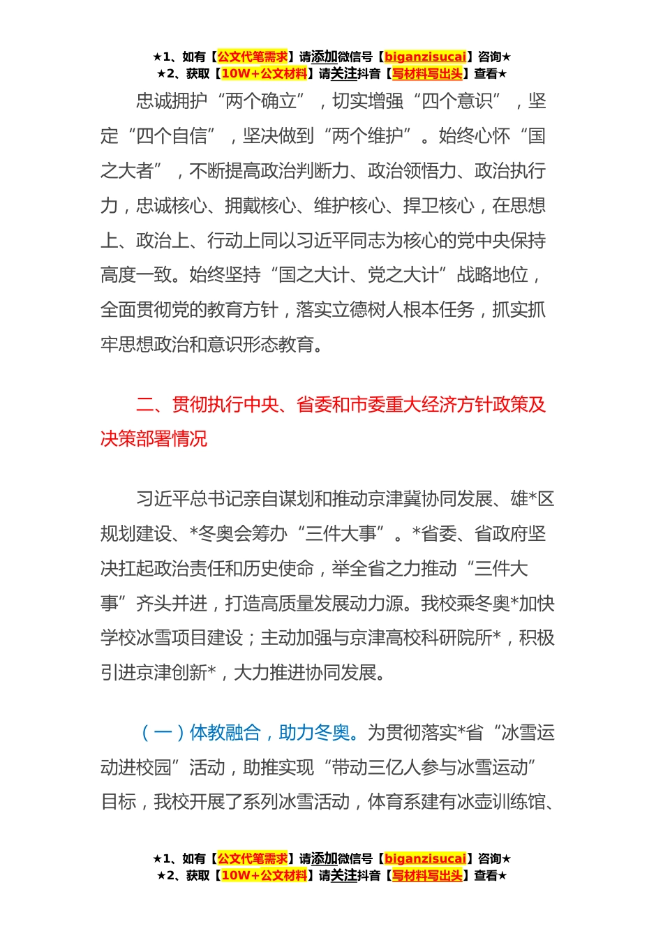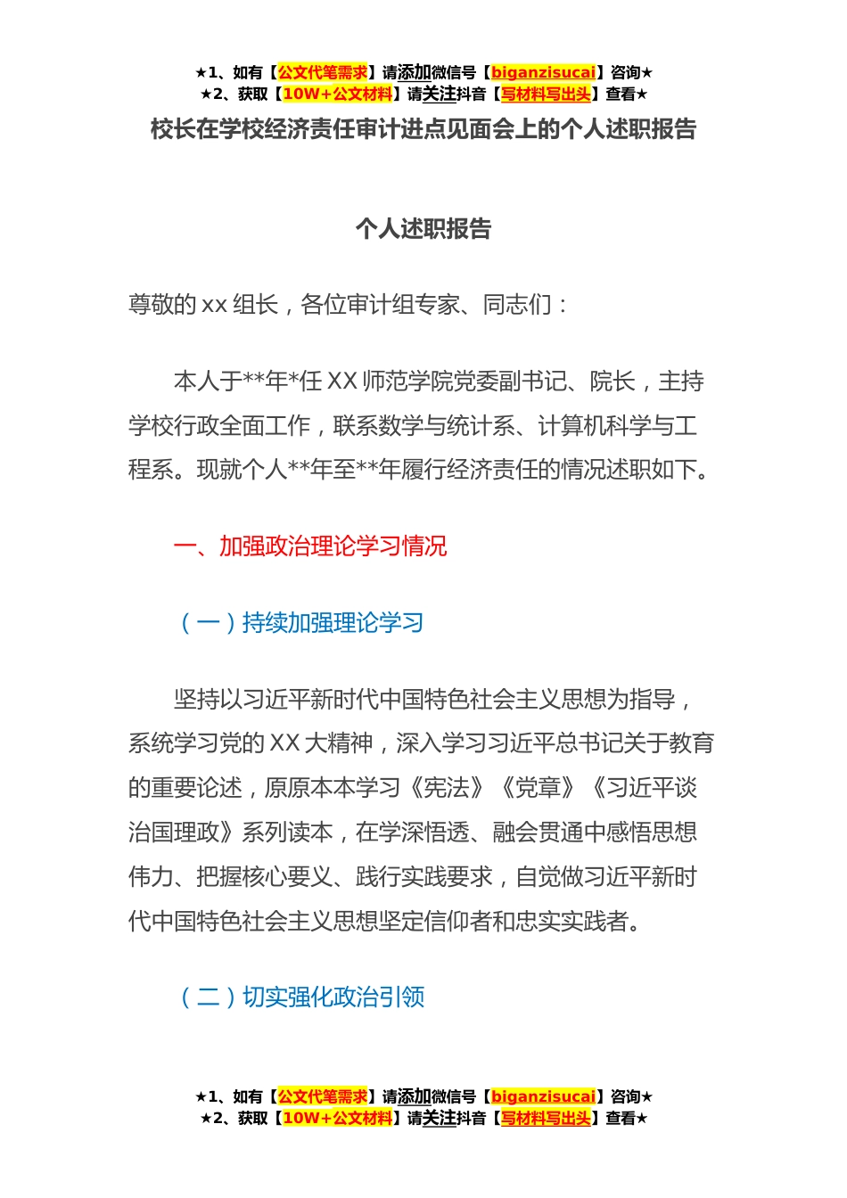 ★1、如有【公文代笔需求】请添加微信号【biganzisucai】咨询★★2、获取【10W+公文材料】请关注抖音【写材料写出头】查看★校长在学校经济责任审计进点见面会上的个人述职报告个人述职报告尊敬的xx组长,各位审计组专家、同志们:本人于**年*任XX师范学院党委副书记、院长,主持学校行政全面工作,联系数学与统计系、计算机科学与工程系。现就个人**年至**年履行经济责任的情况述职如下。一、加强政治理论学习情况(一)持续加强理论学习坚持以习近平新时代中国特色社会主义思想为指导,系统学习党的XX大精神,深入学习习近平总书记关于教育的重要论述,原原本本学习《宪法》《党章》《习近平谈治国理政》系列读本,在学深悟透、融会贯通中感悟思想伟力、把握核心要义、践行实践要求,自觉做习近平新时代中国特色...