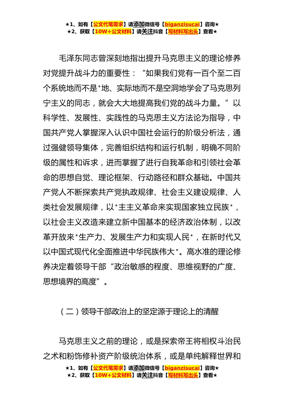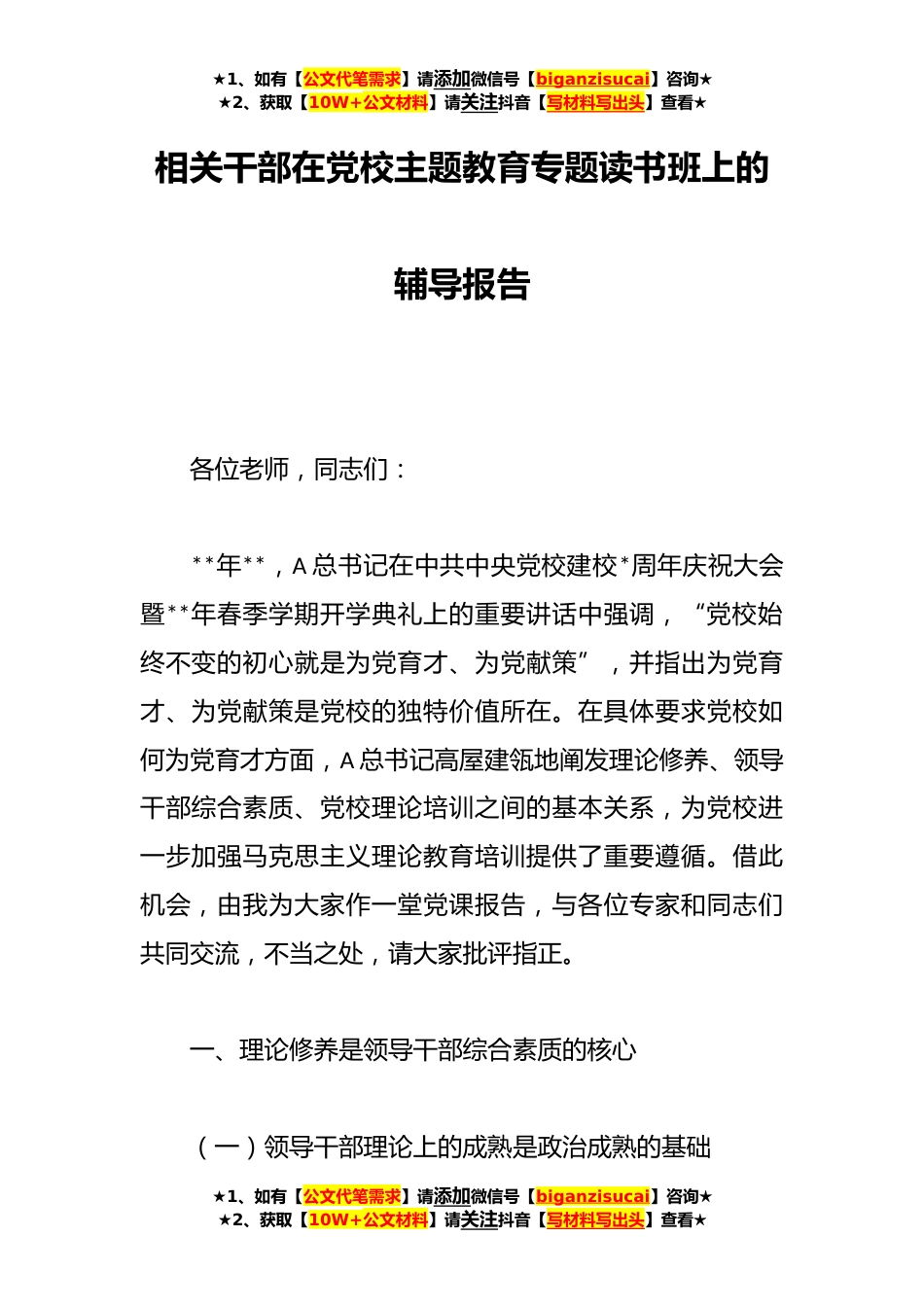 ★1、如有【公文代笔需求】请添加微信号【biganzisucai】咨询★★2、获取【10W+公文材料】请关注抖音【写材料写出头】查看★相关干部在党校主题教育专题读书班上的辅导报告各位老师,同志们:**年**,A总书记在中共中央党校建校*周年庆祝大会暨**年春季学期开学典礼上的重要讲话中强调,“党校始终不变的初心就是为党育才、为党献策”,并指出为党育才、为党献策是党校的独特价值所在。在具体要求党校如何为党育才方面,A总书记高屋建瓴地阐发理论修养、领导干部综合素质、党校理论培训之间的基本关系,为党校进一步加强马克思主义理论教育培训提供了重要遵循。借此机会,由我为大家作一堂党课报告,与各位专家和同志们共同交流,不当之处,请大家批评指正。一、理论修养是领导干部综合素质的核心(一)领导干部理...