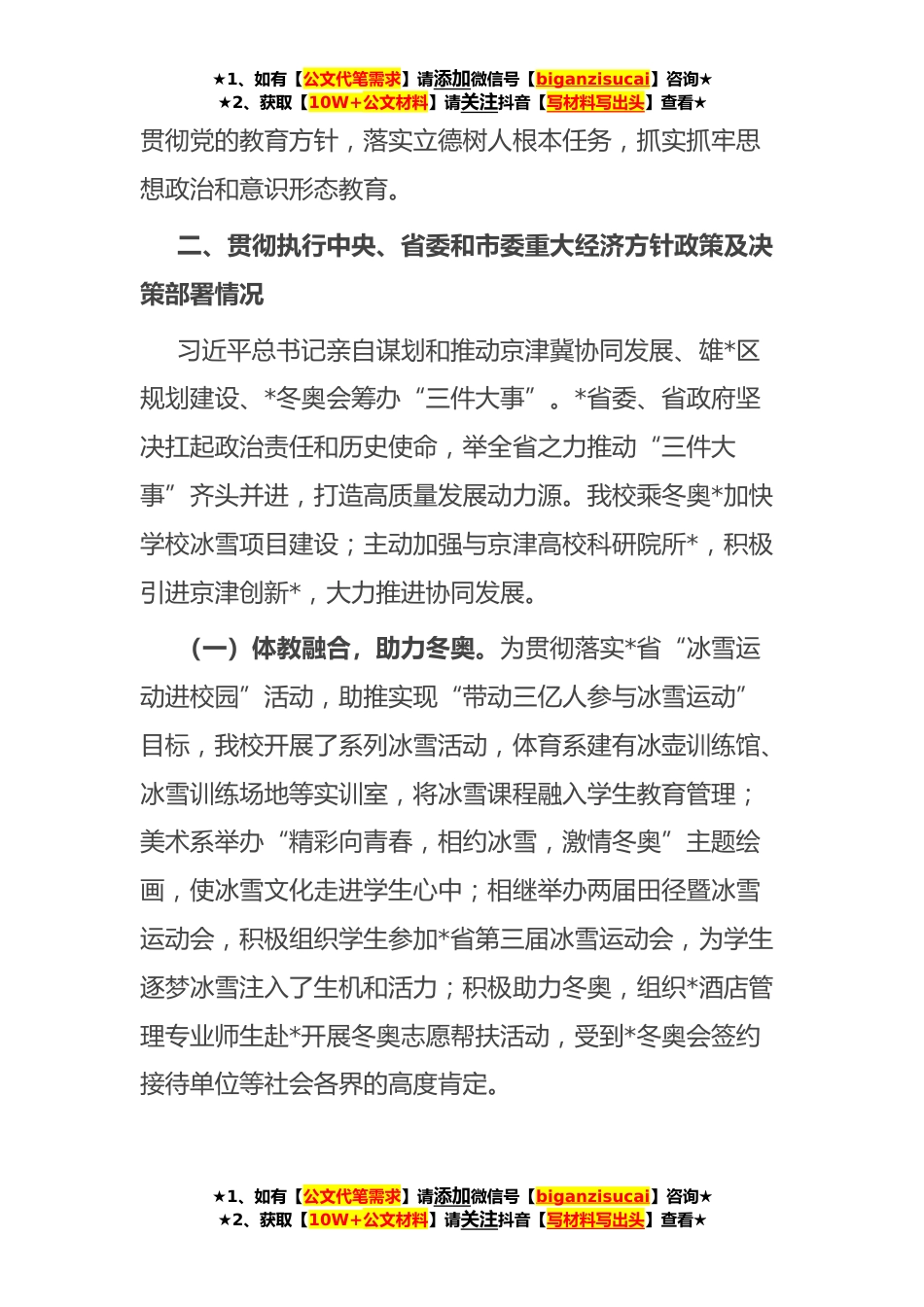 ★1、如有【公文代笔需求】请添加微信号【biganzisucai】咨询★★2、获取【10W+公文材料】请关注抖音【写材料写出头】查看★校长在学校经济责任审计进点见面会上的个人述职报告尊敬的*组长,各位审计组专家、同志们:本人于**年*任师范学院党委副书记、院长,主持学校行政全面工作,联系数学与统计系、计算机科学与工程系。现就个人**年至**年履行经济责任的情况述职如下。一、加强政治理论学习情况(一)持续加强理论学习坚持以习近平新时代中国特色社会主义思想为指导,系统学习党的二十大精神,深入学习习近平总书记关于教育的重要论述,原原本本学习《宪法》《党章》《习近平谈治国理政》系列读本,在学深悟透、融会贯通中感悟思想伟力、把握核心要义、践行实践要求,自觉做习近平新时代中国特色社会主义思想...