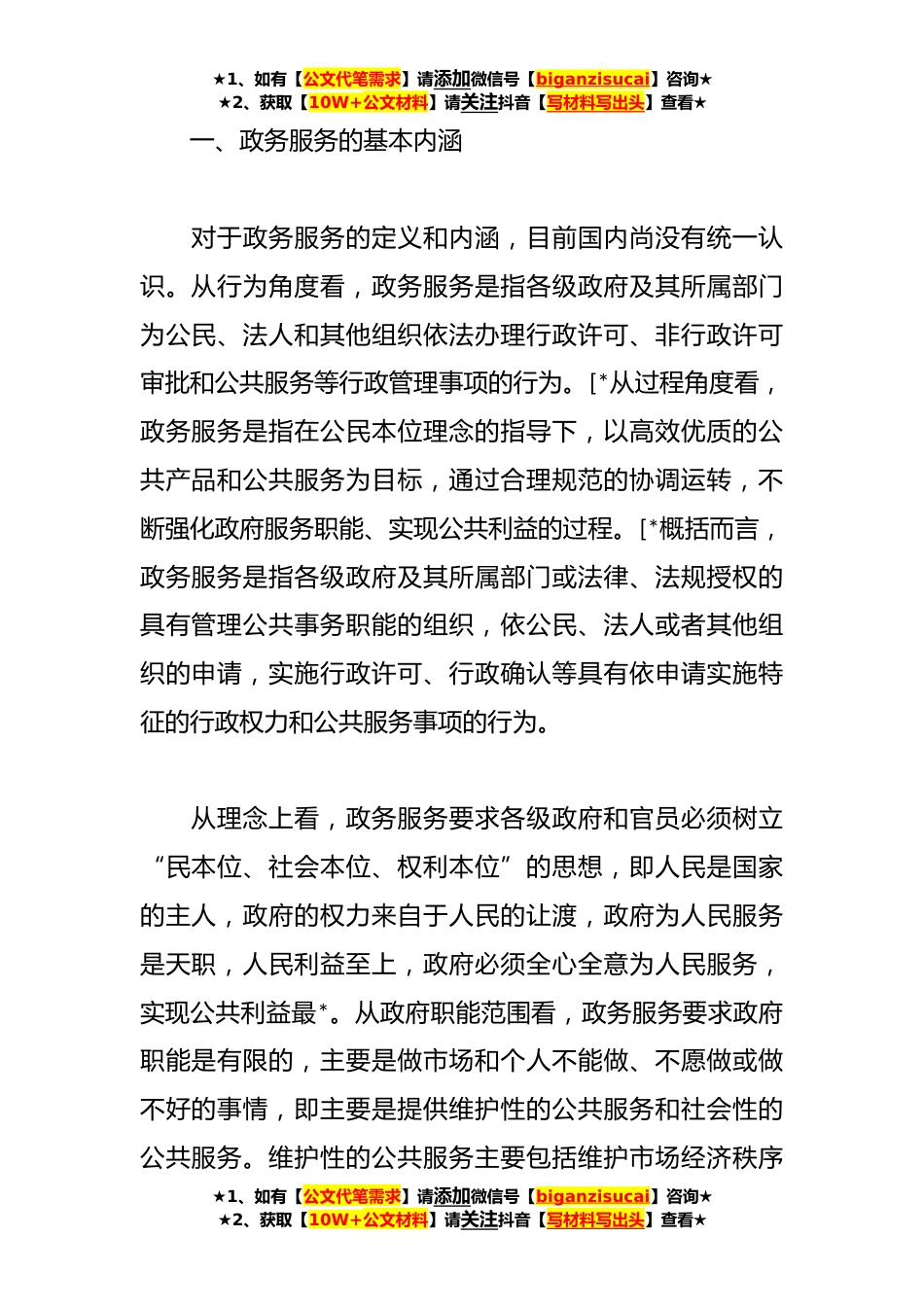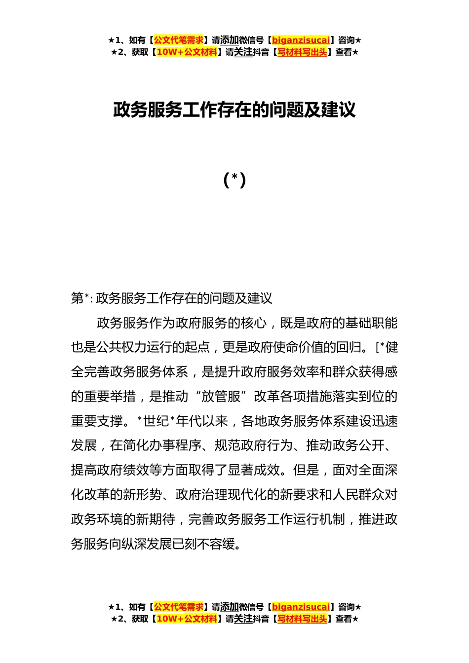 ★1、如有【公文代笔需求】请添加微信号【biganzisucai】咨询★★2、获取【10W+公文材料】请关注抖音【写材料写出头】查看★政务服务工作存在的问题及建议(*)第*:政务服务工作存在的问题及建议政务服务作为政府服务的核心,既是政府的基础职能也是公共权力运行的起点,更是政府使命价值的回归。[*健全完善政务服务体系,是提升政府服务效率和群众获得感的重要举措,是推动“放管服”改革各项措施落实到位的重要支撑。*世纪*年代以来,各地政务服务体系建设迅速发展,在简化办事程序、规范政府行为、推动政务公开、提高政府绩效等方面取得了显著成效。但是,面对全面深化改革的新形势、政府治理现代化的新要求和人民群众对政务环境的新期待,完善政务服务工作运行机制,推进政务服务向纵深发展已刻不容缓。★1、...
