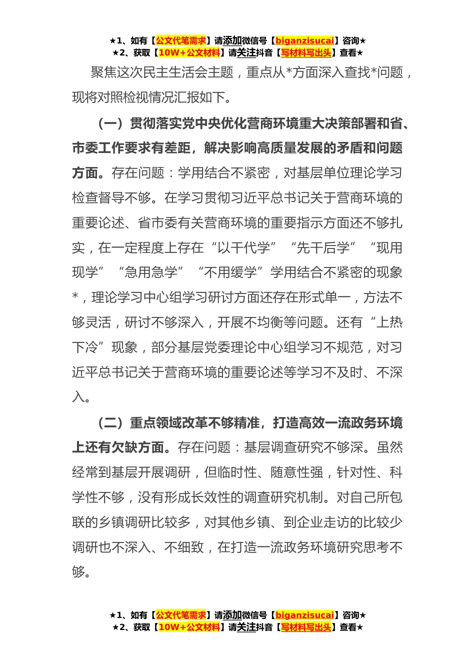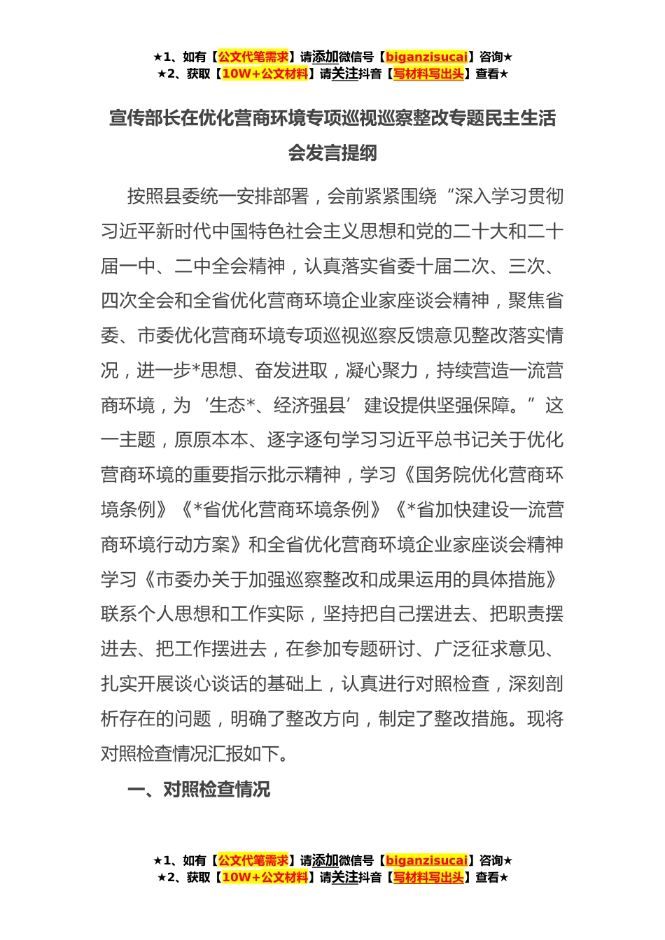 ★1、如有【公文代笔需求】请添加微信号【biganzisucai】咨询★★2、获取【10W+公文材料】请关注抖音【写材料写出头】查看★宣传部长在优化营商环境专项巡视巡察整改专题民主生活会发言提纲按照县委统一安排部署,会前紧紧围绕“深入学习贯彻习近平新时代中国特色社会主义思想和党的二十大和二十届一中、二中全会精神,认真落实省委十届二次、三次、四次全会和全省优化营商环境企业家座谈会精神,聚焦省委、市委优化营商环境专项巡视巡察反馈意见整改落实情况,进一步*思想、奋发进取,凝心聚力,持续营造一流营商环境,为‘生态*、经济强县’建设提供坚强保障。”这一主题,原原本本、逐字逐句学习习近平总书记关于优化营商环境的重要指示批示精神,学习《国务院优化营商环境条例》《*省优化营商环境条例》《*省...