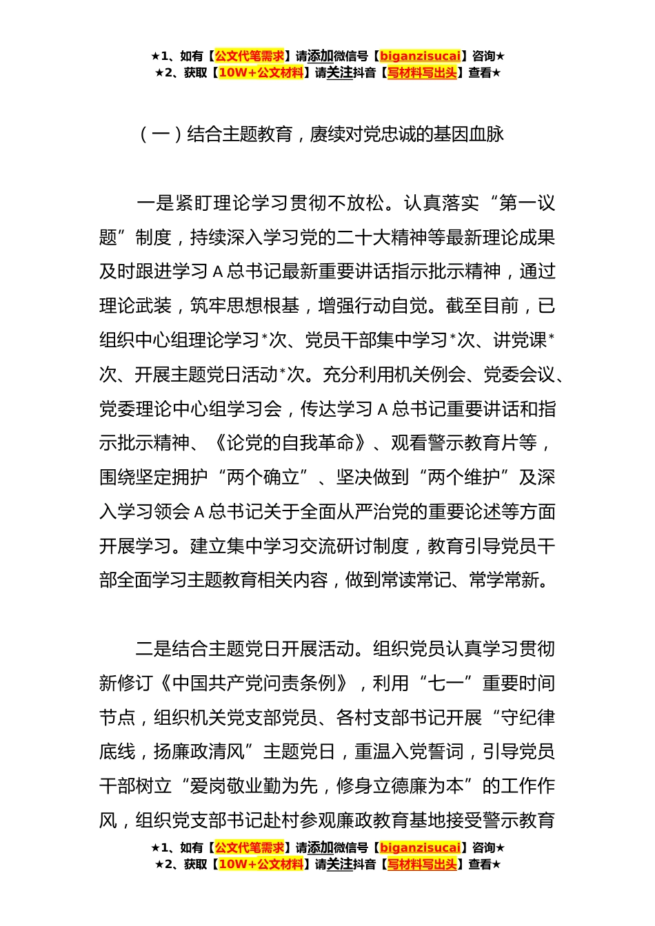 ★1、如有【公文代笔需求】请添加微信号【biganzisucai】咨询★★2、获取【10W+公文材料】请关注抖音【写材料写出头】查看★**年班子落实全面从严治党主体责任落实情况报告落实全面从严治党主体责任落实情况报告**年以来,在市委、市政府的坚强领导下,党委坚持以A新时代中国特色社会主义思想为指导,紧紧围绕深入学习宣传贯彻党的二十大精神主题主线,全面贯彻A总书记关于全面从严治党重要论述精神,认真落实中央、省、市党风廉政建设各项工作部署,坚持以党的政治建设为统领,强化党建工作引领示范,坚持抓住“关键少数”和管住“绝大多数”,不断强化主责意识,健全责任体系,落实“两个责任”,推动全面从严治党不断向纵深发展、向基层延伸,为推动事业健康发展提供了坚强保证。现将履责情况报告如下:一、主...