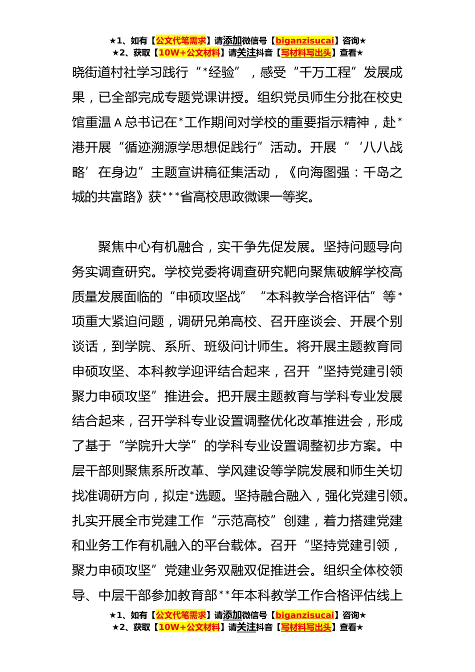 ★1、如有【公文代笔需求】请添加微信号【biganzisucai】咨询★★2、获取【10W+公文材料】请关注抖音【写材料写出头】查看★学校在主题教育阶段性推进会上的汇报尊敬的指导组各位领导,同志们:学校党委坚持将开展主题教育作为当前重大政治任务牢记A总书记在*工作期间来我校考察时的重要指示精神,坚持一体推进、有机融合、协同发力,切实把学习成效转化为立德树人、推动发展、服务地方的强大力量。根据会议安排,现将有关工作进展情况汇报如下:一体推进六学联动,以学铸魂强党性。重部署与建机制“一体推进”。学校党委第一时间传达主题教育会议精神并成立领导小组,召开动员会和中层干部调查研究专题培训会,开展中心组集体学习*,交流发言*人次。召开主题教育专题党课,学院书记作主题教育专题党课。带头学与...