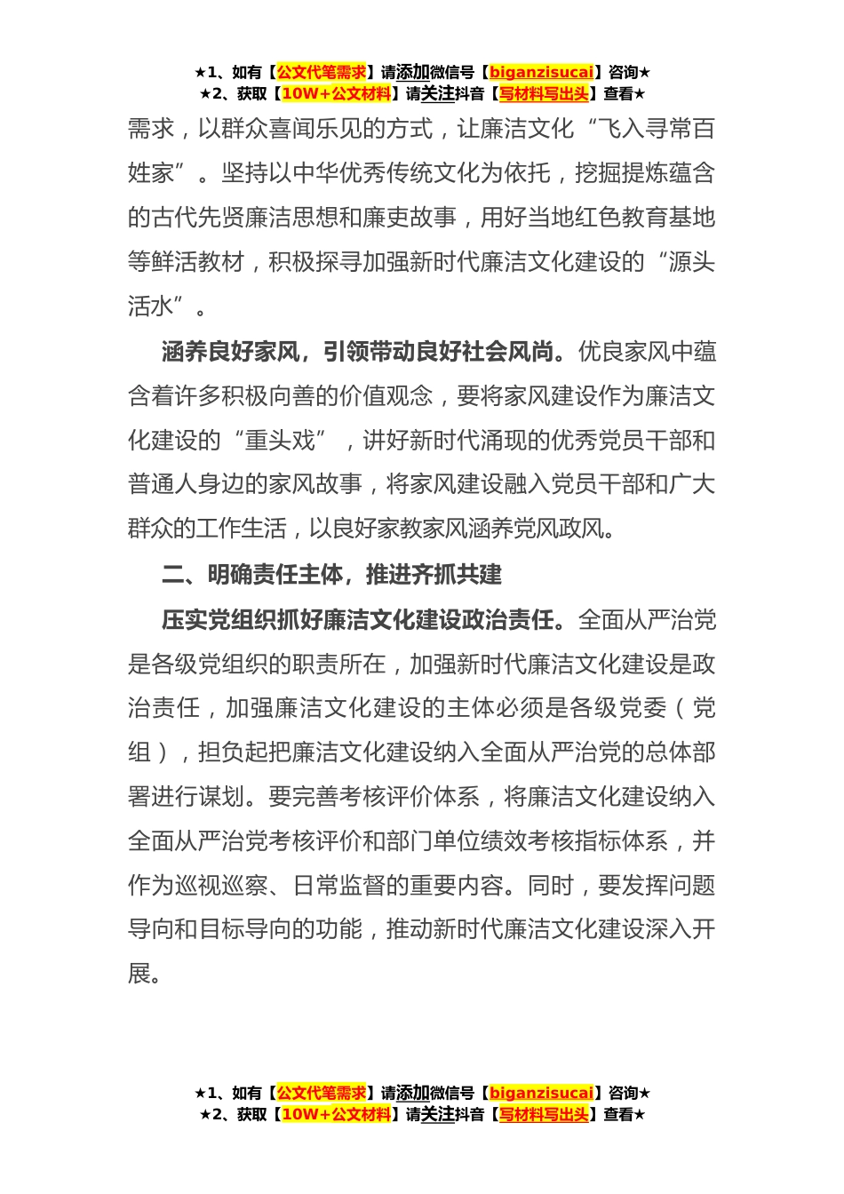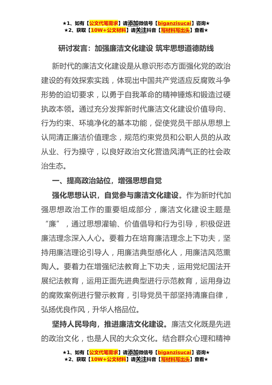 ★1、如有【公文代笔需求】请添加微信号【biganzisucai】咨询★★2、获取【10W+公文材料】请关注抖音【写材料写出头】查看★研讨发言:加强廉洁文化建设筑牢思想道德防线新时代的廉洁文化建设是从意识形态方面强化党的政治建设的有效探索实践,体现出中国共产党适应反腐败斗争形势的迫切要求,以勇于自我革命的精神锤炼和锻造过硬执政本领。通过充分发挥新时代廉洁文化建设价值导向、行为约束、环境净化的基本功能,促使党员干部从思想上认同清正廉洁价值理念,规范约束党员和公职人员的从政从业、行为操守,以良好政治文化营造风清气正的社会政治生态。一、提高政治站位,增强思想自觉强化思想认识,自觉参与廉洁文化建设。作为新时代加强思想政治工作的重要组成部分,廉洁文化建设主题是“廉”,通过思想灌输、...