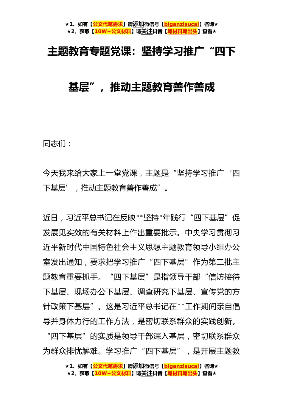 ★1、如有【公文代笔需求】请添加微信号【biganzisucai】咨询★★2、获取【10W+公文材料】请关注抖音【写材料写出头】查看★主题教育专题党课:坚持学习推广“四下基层”,推动主题教育善作善成同志们:今天我来给大家上一堂党课,主题是“坚持学习推广‘四下基层’,推动主题教育善作善成”。近日,习近平总书记在反映**坚持*年践行“四下基层”促发展见实效的有关材料上作出重要批示。中央学习贯彻习近平新时代中国特色社会主义思想主题教育领导小组办公室发出通知,要求把学习推广“四下基层”作为第二批主题教育重要抓手。“四下基层”是指领导干部“信访接待下基层、现场办公下基层、调查研究下基层、宣传党的方针政策下基层”。这是习近平总书记在**工作期间亲自倡导并身体力行的工作方法,是密切联系群众的...