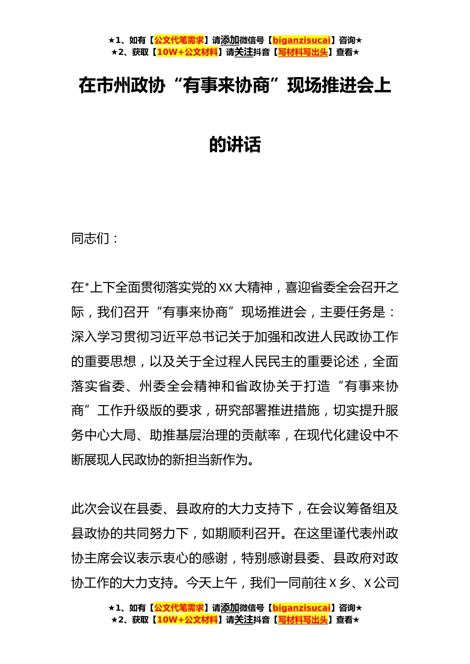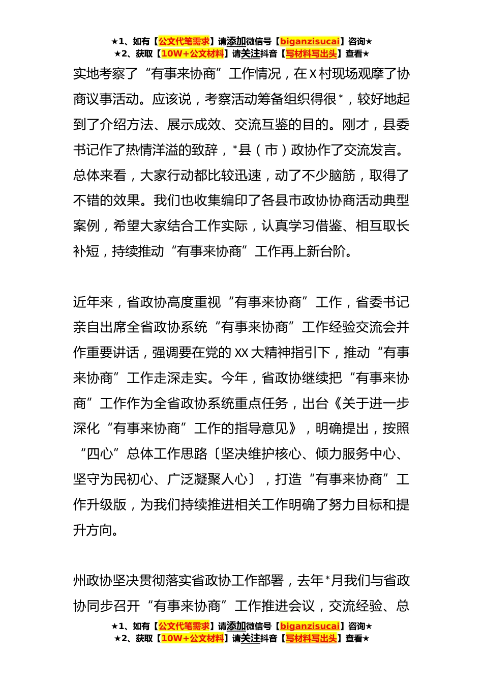 ★1、如有【公文代笔需求】请添加微信号【biganzisucai】咨询★★2、获取【10W+公文材料】请关注抖音【写材料写出头】查看★在市州政协“有事来协商”现场推进会上的讲话同志们:在*上下全面贯彻落实党的XX大精神,喜迎省委全会召开之际,我们召开“有事来协商”现场推进会,主要任务是:深入学习贯彻习近平总书记关于加强和改进人民政协工作的重要思想,以及关于全过程人民民主的重要论述,全面落实省委、州委全会精神和省政协关于打造“有事来协商”工作升级版的要求,研究部署推进措施,切实提升服务中心大局、助推基层治理的贡献率,在现代化建设中不断展现人民政协的新担当新作为。此次会议在县委、县政府的大力支持下,在会议筹备组及县政协的共同努力下,如期顺利召开。在这里谨代表州政协主席会议表示衷心...