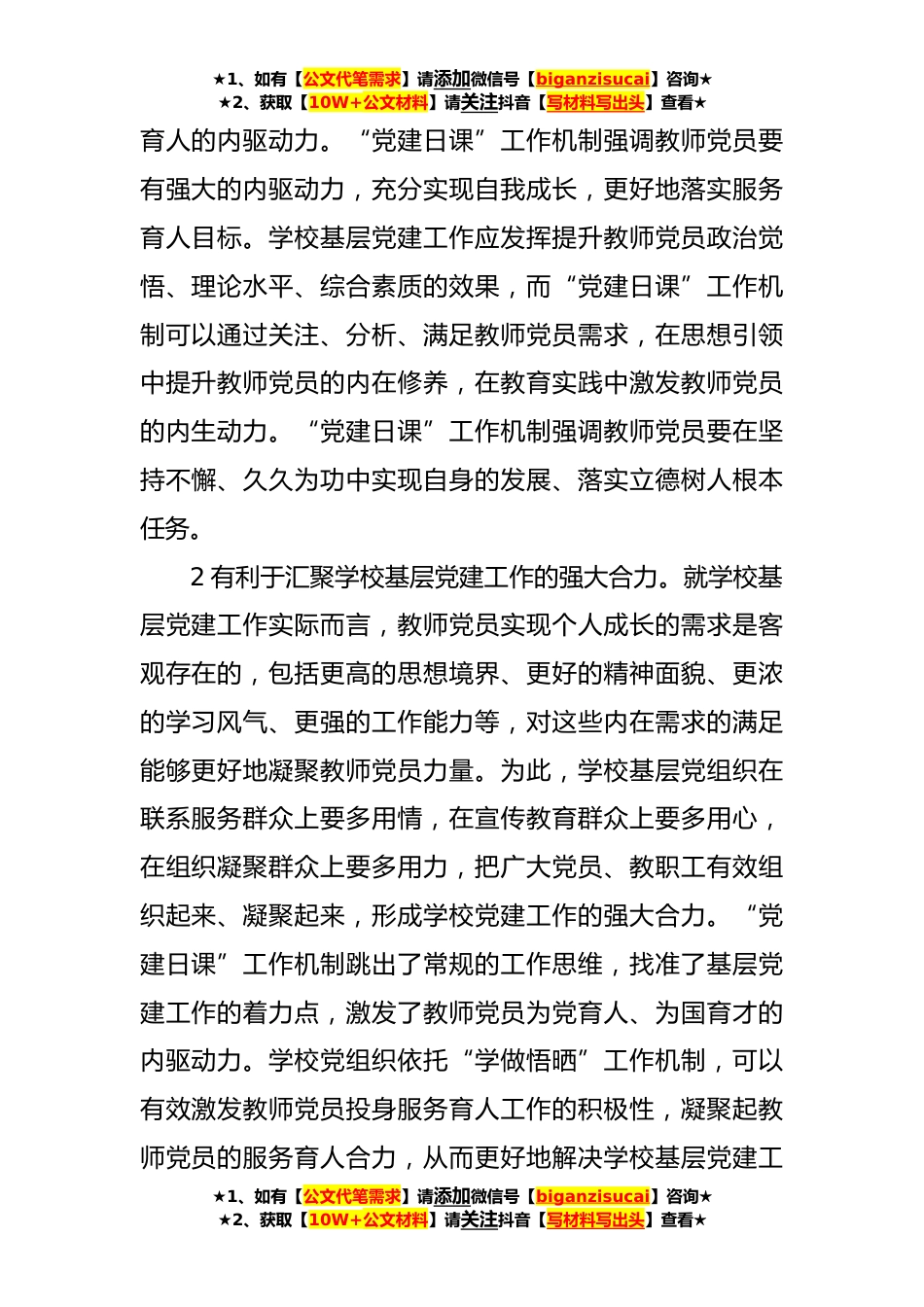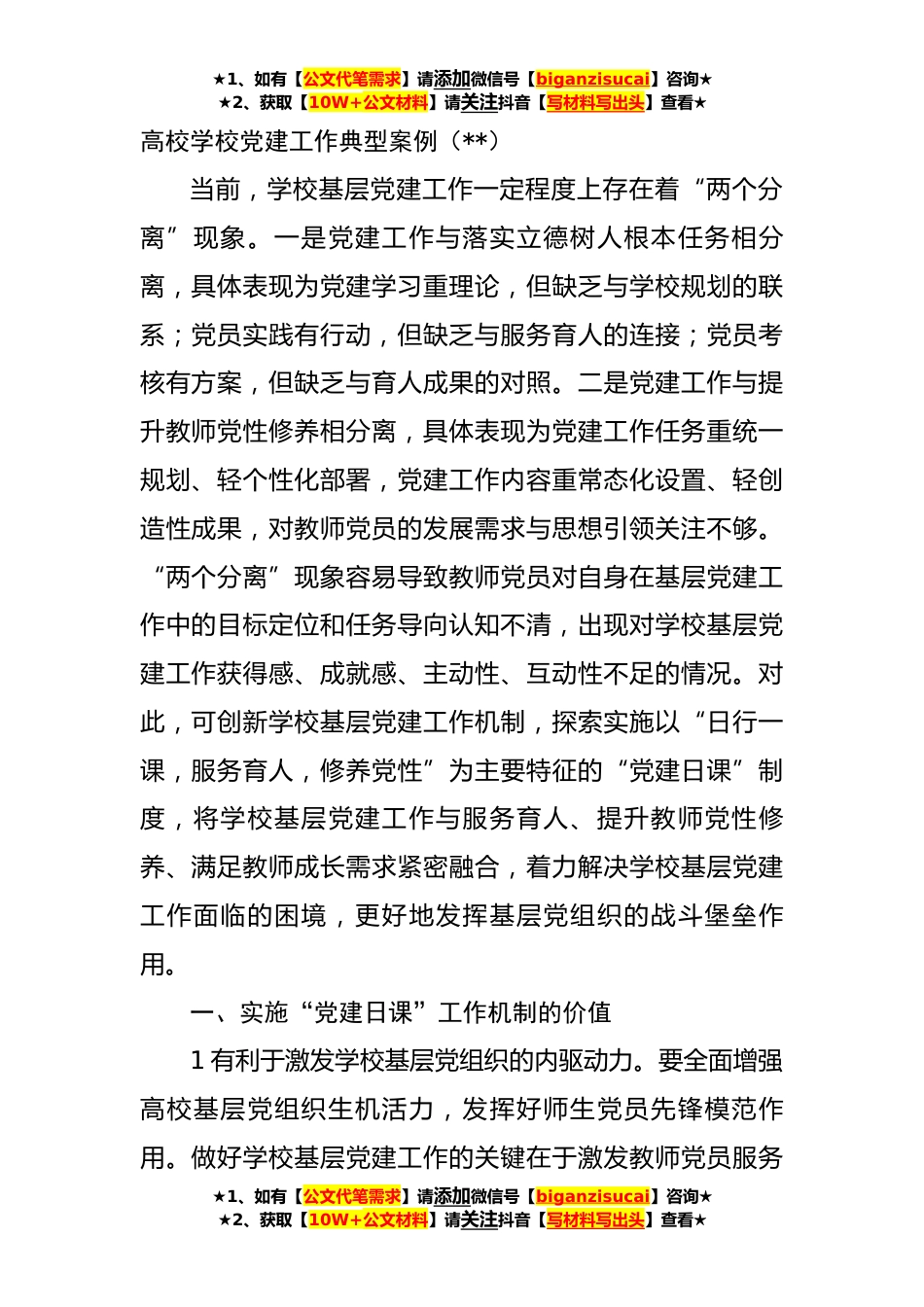 ★1、如有【公文代笔需求】请添加微信号【biganzisucai】咨询★★2、获取【10W+公文材料】请关注抖音【写材料写出头】查看★高校学校党建工作典型案例(**)当前,学校基层党建工作一定程度上存在着“两个分离”现象。一是党建工作与落实立德树人根本任务相分离,具体表现为党建学习重理论,但缺乏与学校规划的联系;党员实践有行动,但缺乏与服务育人的连接;党员考核有方案,但缺乏与育人成果的对照。二是党建工作与提升教师党性修养相分离,具体表现为党建工作任务重统一规划、轻个性化部署,党建工作内容重常态化设置、轻创造性成果,对教师党员的发展需求与思想引领关注不够。“两个分离”现象容易导致教师党员对自身在基层党建工作中的目标定位和任务导向认知不清,出现对学校基层党建工作获得感、成就感、...
