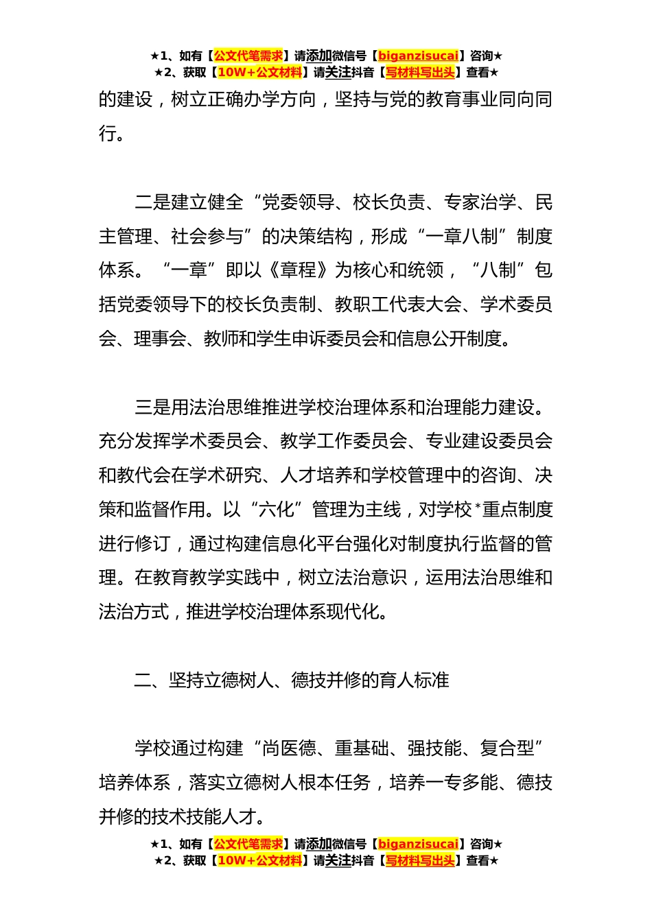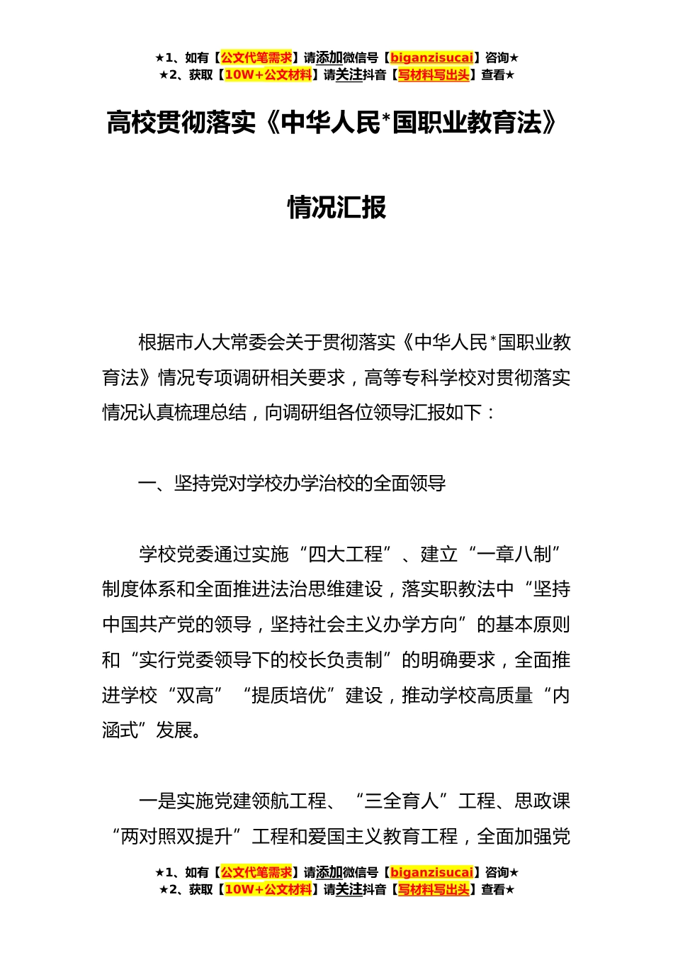 ★1、如有【公文代笔需求】请添加微信号【biganzisucai】咨询★★2、获取【10W+公文材料】请关注抖音【写材料写出头】查看★高校贯彻落实《中华人民*国职业教育法》情况汇报根据市人大常委会关于贯彻落实《中华人民*国职业教育法》情况专项调研相关要求,高等专科学校对贯彻落实情况认真梳理总结,向调研组各位领导汇报如下:一、坚持党对学校办学治校的全面领导学校党委通过实施“四大工程”、建立“一章八制”制度体系和全面推进法治思维建设,落实职教法中“坚持中国共产党的领导,坚持社会主义办学方向”的基本原则和“实行党委领导下的校长负责制”的明确要求,全面推进学校“双高”“提质培优”建设,推动学校高质量“内涵式”发展。一是实施党建领航工程、“三全育人”工程、思政课“两对照双提升”工程和...