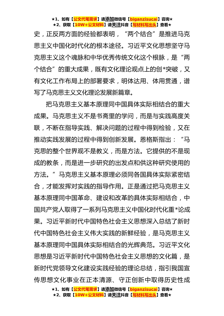 ★1、如有【公文代笔需求】请添加微信号【biganzisucai】咨询★★2、获取【10W+公文材料】请关注抖音【写材料写出头】查看★中心组研讨发言:坚持“两个结合”更好担负起新的文化使命(**字)在五千多年中华文明深厚基础上开辟和发展中国特色社会主义,把马克思主义基本原理同中国具体实际、同中华优秀传统文化相结合是必由之路。“两个结合”是我们党在探索中国特色社会主义道路中得出的规律性认识,是我们推进马克思主义中国化时代化的根本途径。习近平新时代中国特色社会主义思想是当代中国马克思主义、*纪马克思主义,实现了马克思主义中国化时代化新的飞跃。作为习近平新时代中国特色社会主义思想的文化篇,习近平文化思想为做好新时代新征程宣传思想文化工作、担负起新的文化使命提供了强大思想武器和科学行...