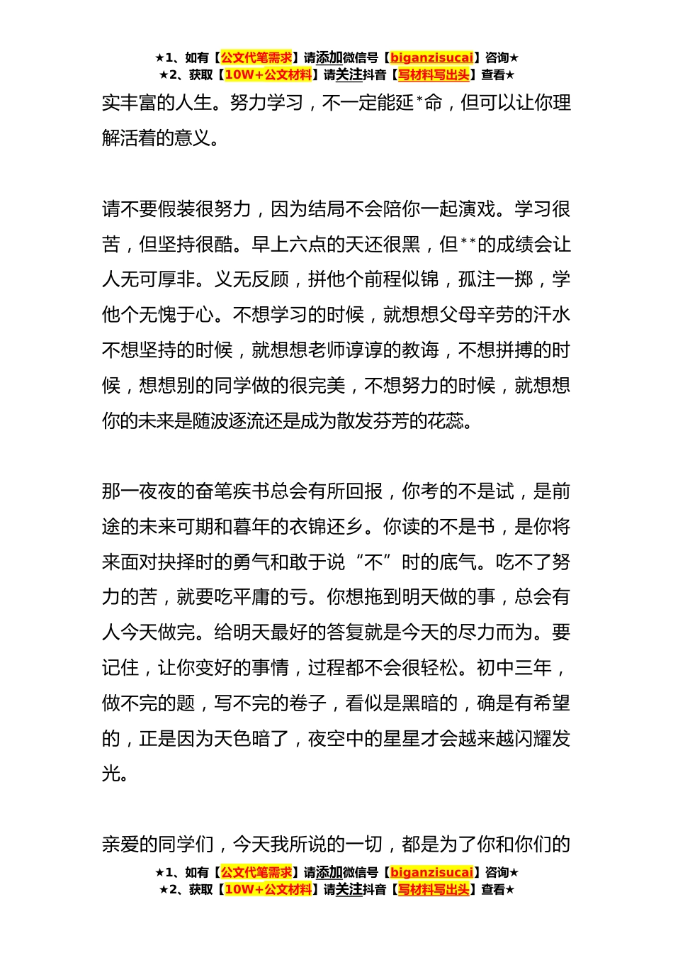 ★1、如有【公文代笔需求】请添加微信号【biganzisucai】咨询★★2、获取【10W+公文材料】请关注抖音【写材料写出头】查看★XX中学综合行政中心主任在第十一周升旗仪式上的讲话各位老师、同学们:大家早上好!我为座落在X河之滨的XX人感到庆幸,因为人类文明的第一行脚印是踩在湿漉漉的河边,通过逐水而居,不断孕育和形成人类社会文明。今天,我们有两千多位朝气蓬勃的新时代少年,正伫立于X河水畔,屹立于焚书*,不断学习、传承、发扬优秀的中华文化,更是有无穷的潜力可以挖掘和迸发。为此,我想和大家分享的话题是努力学习,青春有为。努力学习,不一定能大富大贵,但可以让你见识更宽广的世界。努力学习,不一定能指点*,但可以让你有更多选择的机会。努力学习,不一定能走向*,但可以让你拥有更充★1、如有...
