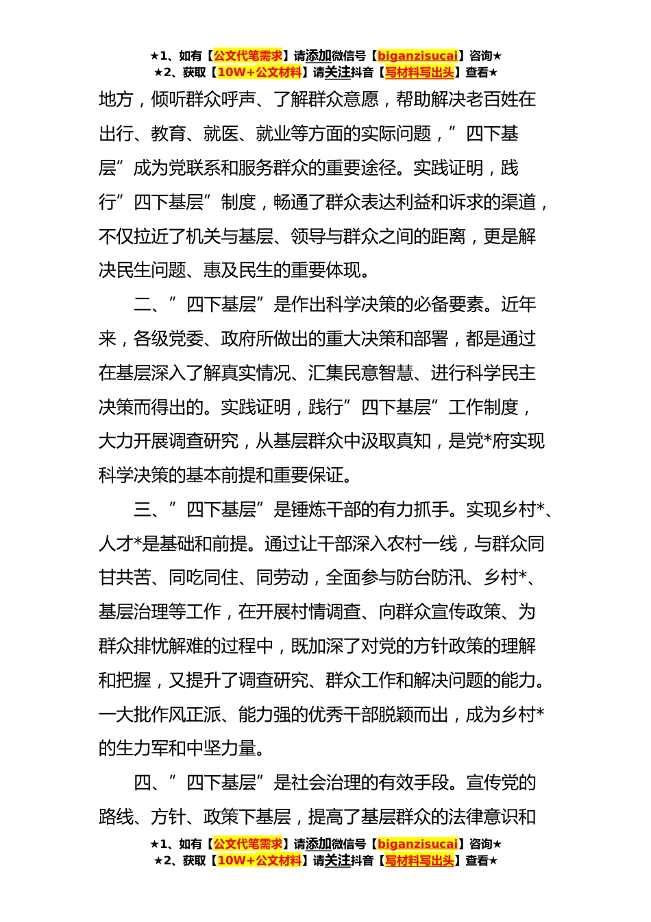 ★1、如有【公文代笔需求】请添加微信号【biganzisucai】咨询★★2、获取【10W+公文材料】请关注抖音【写材料写出头】查看★“四下基层”专题研讨发言“四下基层”是指在宣传党的路线、方针、政策、调查研究、信访接待、现场办公等方面下沉到基层的工作方式和制度。这是习近平同志在**工作期间提出并实践的工作方法。它体现了务实求真的思想方法,彰显了以人民为中心的价值追求,展示了真抓实干的责任担当。对于转变干部作风、密切联系群众,解决工作难题、推动高质量发展,加强党的建设、做好各项工作等方面,都具有重要意义。当前,第二批主题教育正在积极展开,相较于第一批主题教育,第二批更加注重下沉到基层,推动主题教育更深入、更充实、更实效。我们要深刻理解“四下基层”的内涵、时代价值和实践要求,...