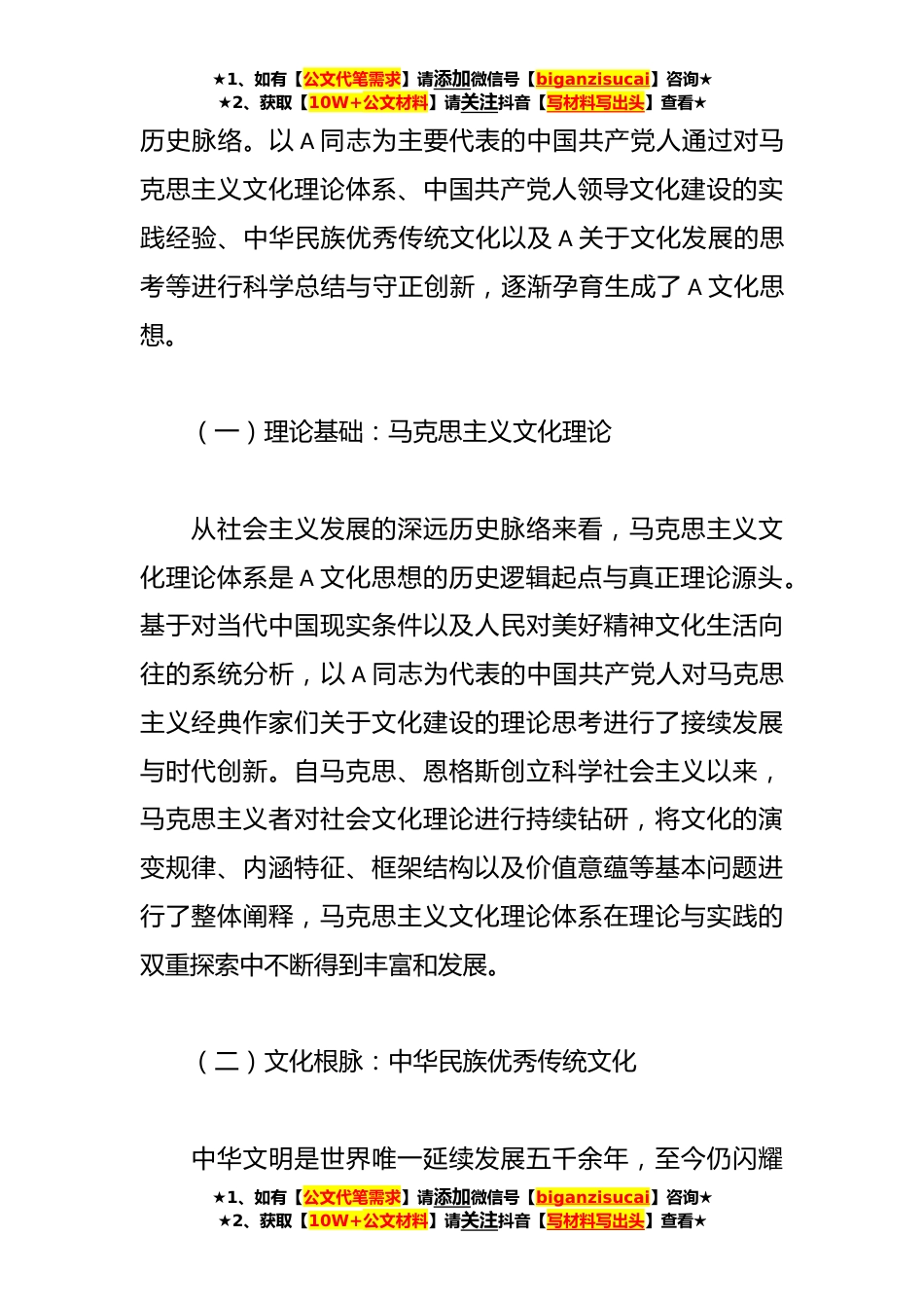 ★1、如有【公文代笔需求】请添加微信号【biganzisucai】咨询★★2、获取【10W+公文材料】请关注抖音【写材料写出头】查看★县级领导主题教育专题党课:学深悟透A文化思想,开创全县宣传思想文化工作新局面党的十八大以来,A总书记在新时代文化建设方面提出了一系列新思想新观点新论断。**年*月,全国宣传思想文化工作会议首次明确提出A文化思想,标志着A新时代中国特色社会主义思想开启了文化新篇章。今天我们召开专题党课,就是要以学习贯彻A新时代中国特色社会主义思想为重要抓手,对A文化思想的生成逻辑、内在特质、价值锚定作出分析,指导全市宣传思想文化工作迈上新台阶。一、A文化思想的历史根基与生成逻辑历史从哪里发端,思想进程也应当从哪里开始。从历史与思维逻辑进行审思,A文化思想有着深刻的出场逻...